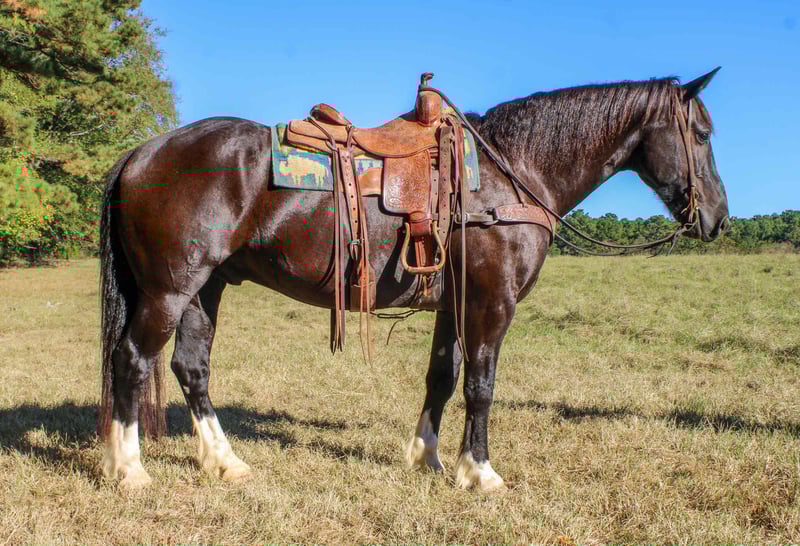 ONLINE AUCTION Place your bids at www.PlatinumEquineAuction.com Starting Bid $3500 Auction ends November 2nd, 2025 Need a new saddle? Check out White Rock Saddles on our website or Facebook Hercules is a stunning black crossbred gelding, with 4 white feet, featuring and big mane and tail he is sure to get you noticed everywhere you go! Hercules is 8 years old, he is 15.1 hands tall and stout. Bred for athleticism and beauty, he boasts elegant movement and a trainable mind. Hercules has been rode extensively outside, for all aspects of ranch work, from roping and doctoring cattle outside to sorting in the pens he has done it all! Hercules has a solid neck rein, has a good stop, he pivots nicely and works great off leg pressure! He goes anywhere he is asked and always has a willing attitude! Hercules lopes nice circles, knows his leads and is very enjoyable to ride! Super nice all around crossbred gelding! Hercules is located in Rusk TX, nationwide shipping is available! Call or text Rachel with TR Livestock 605-370-4644 for more info. ONLINE AUCTION Place your bids at www.PlatinumEquineAuction.com Starting Bid $3500 Auction ends November 2nd, 2025 Need a new saddle? Check out White Rock Saddles on our website or Facebook