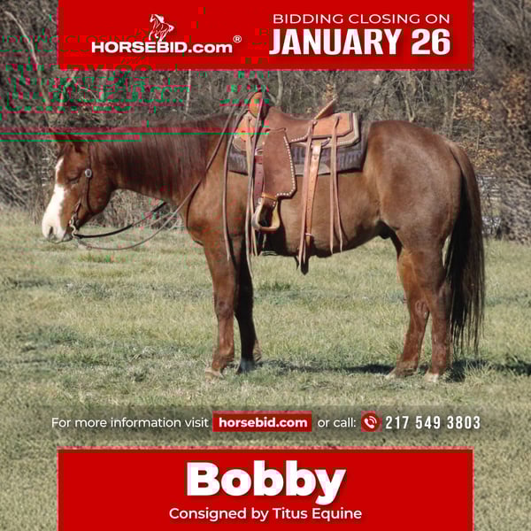 𝐉𝐀𝐍𝐔𝐀𝐑𝐘 ⭐️𝑨𝒍𝒍 𝑺𝒕𝒂𝒓 𝑳𝒊𝒏𝒆𝒖𝒑⭐️ Happening now thru MONDAY | JANUARY 26th - Available EXCLUSIVELY on HorseBid's website! For more details and to register visit: www.Horsebid.com CONSIGNOR CONTACT: Titus Equine 217 549 3803 LOCATION: Brownstown, IL BREED: AQHA REGISTERED: Yes REGISTERED NAME: JT Red Sandy Baily COLOR: Red Roan HEIGHT: 15.1 AGE: 9 GENDER: Gelding Bobby – AQHA Splash White Red Roan Gelding – Safe, Fancy Broke & Ready! Bobby’s as rare in color as he is in broke-ness. This 15.1h red roan Splash White gelding is solid enough for the whole family but fancy broke enough to make an old hand grin ear to ear. He’s got all the buttons—ride him on the ranch, rope one out of the box, throw a lesson on him, head to town, or hit the trails. He’s been everywhere and done it all, calm, smart, and willing every step of the way. Bobby spins, stops, backs, and turns on a dime, handles cattle like he was born in the pasture, and rides quiet in town. Trails? He’ll step over, pick his way, and cruise anything without a flinch. His one-of-a-kind color turns heads, but it’s his brains, manners, and grit that make him a horse you can bet your boots on. Strong, steady, and fancy broke, Bobby’s ready for the show pen, ranch work, lessons, or family rides. Step off the trailer and hop on—he’s ready to go, whether it’s chasing cattle, cruising sunset trails, or just soaking up a smooth ride. Bobby’s the real deal, talented, smart, safe, and built to impress, looking for a rider who wants a horse that can do it all, turn heads, and never throw in the towel.