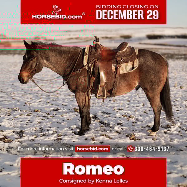 ⚜️𝐓𝐇𝐄 𝓗𝓮𝓻𝓲𝓽𝓪𝓰𝓮 𝐖𝐢𝐧𝐭𝐞𝐫 𝓒𝓵𝓪𝓼𝓼𝓲𝓬⚜️ Happening now thru MONDAY | DECEMBER 29th - Available EXCLUSIVELY on HorseBid's website! For more details and to register visit: www.Horsebid.com CONSIGNOR CONTACT: Kenna Lelles 330-464-9137 LOCATION: Dalton, OH BREED: Quarter Horse (Grade) REGISTERED: No REGISTERED NAME: Romeo COLOR: Roan HEIGHT: 14.1 AGE: 8 GENDER: Gelding Romeo definitely earned his name. He’s as sweet as they come and a total love bug. He genuinely enjoys people, especially kids, and even spent this past summer working in a therapy program thanks to his gentle, steady temperament. Romeo is a true all-around gelding. He was started on the barrel pattern but has never been pushed and stays quiet and correct. He’s been roped off of both live cattle and a dummy, and will happily slow down for arena work when asked. Out on the trail, he’s steady and confident whether you’re riding in a group or heading out alone. He’s traffic safe, has seen all kinds of farm equipment, and takes everything in stride. He hauls beautifully, loads easily, and has been off the property plenty. Romeo has a nice walk, trot, and lope, and while he’s naturally quiet and easygoing, he does have speed available when you ask. Romeo has been my personal horse for the past three years. He is uncomplicated, willing, and enjoyable to be around.
