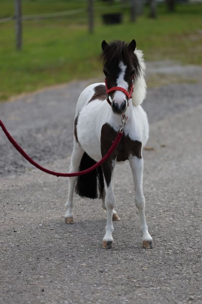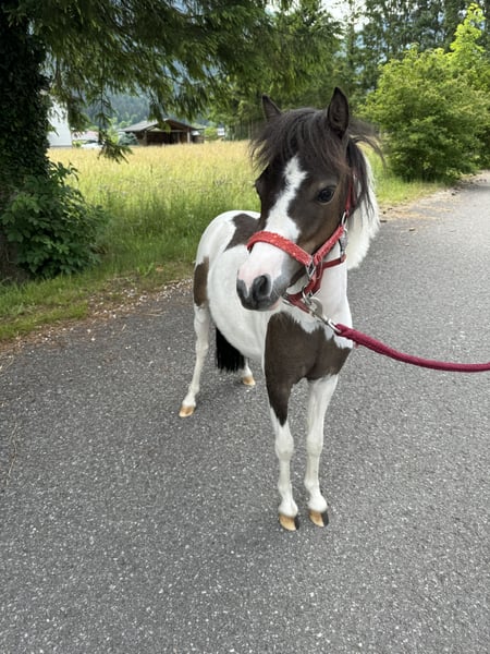 Little Beauty’s Bella – AMH mare with American pedigree Due to a lack of time, I am sadly looking for a 5-star home for my Bella. This beautiful mare is 4 years old and I have owned her for 3 years. She loves to be the center of attention and to be challenged. Groundwork, small jumps, and walks are no problem for her, whether alone or in a herd. Currently, she lives in a group of four (miniatures and sheep) at a riding stable and is familiar with full-sized horses, children, the farrier, trailer loading, indoor arena, etc. I am hoping to find a dream home for this amazing mini with plenty of turnout, a friendly herd, and someone who will give her lots of attention. Thanks to her fearless nature, I can very well imagine her later in a therapy role. Because of her top pedigree and American papers, she is also certainly interesting for breeding! Important: Due to her breed, she CANNOT be ridden! She is also not suitable as a riding horse for children. 5 🥕 Including all accessories (halter, lead rope, blankets, mini-special feed, etc.)