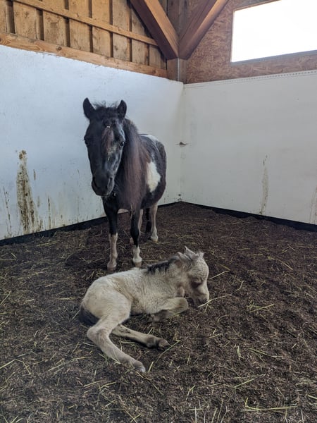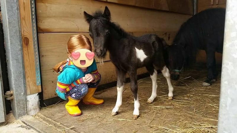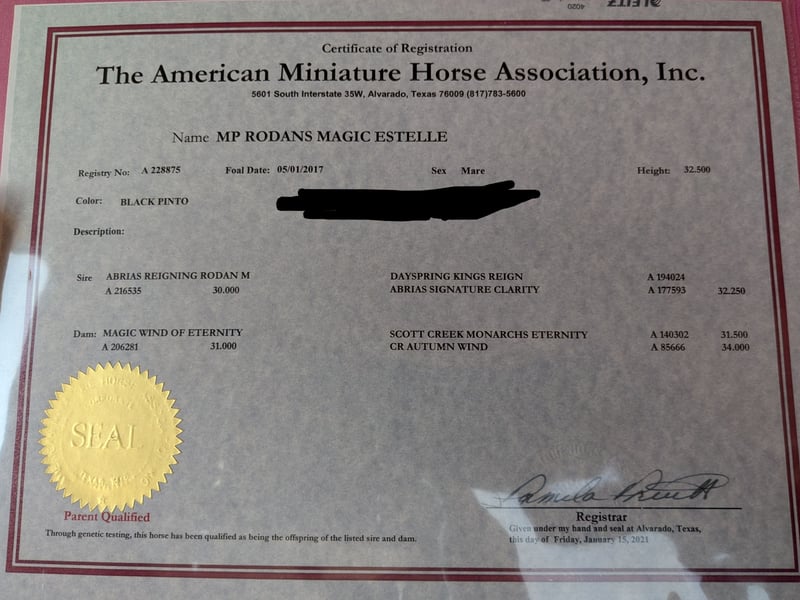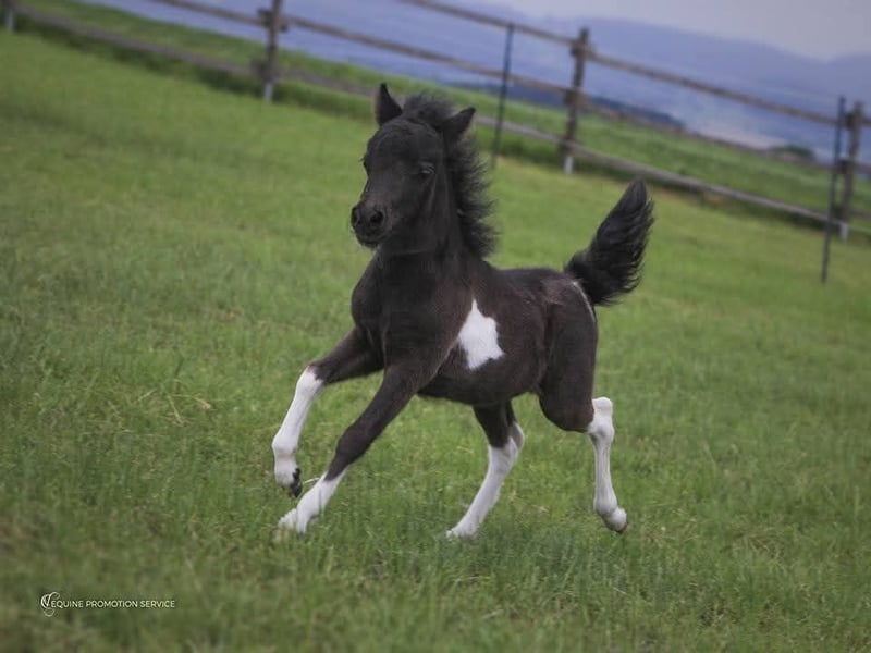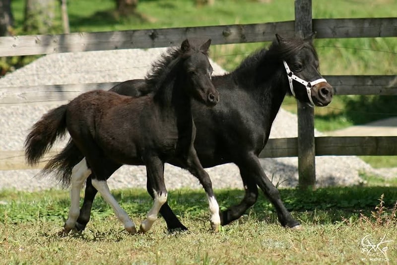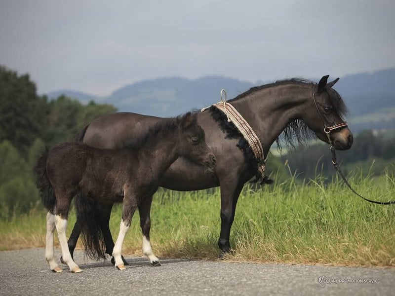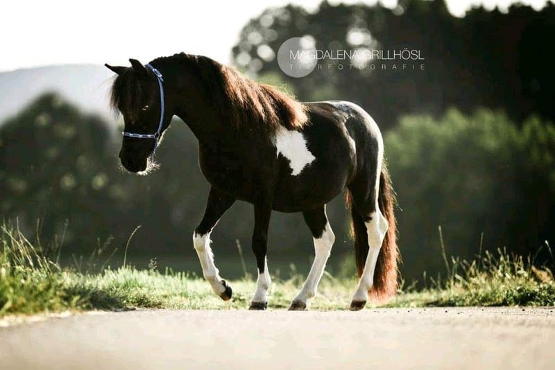 Our little star is a very sweet, well-conformed, and energetic AMHA mare with a star on her forehead, bred from our own stock! She was awarded a 9.0 as a foal by the ZfdP and was later registered as a Verband premium mare in the studbook. So far, she has had two foals, both of which received premiums. Her most recent foal from 2024, a champagne-colored sabino mare, was awarded an 8.5 and may also be sold. She had two trouble-free births and is a wonderful mother. Star is healthy, presented to the hoof orthopedist every six weeks, and is regularly vaccinated and dewormed. She lives in an open stable with a small herd and end-sized ponies, and is very well socialized. Star grew up with children and is gentle in handling. Unfortunately, my children are now too grown, and I have given up breeding for personal reasons, which is why she is somewhat underused. The photos show Star from foalhood to adulthood. Her pedigree is in the last photo—an absolute gem for breeding, but also perfect as a leisure partner! Star will only be sold to the best hands! Further information available upon request.