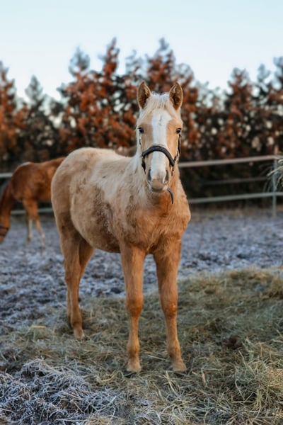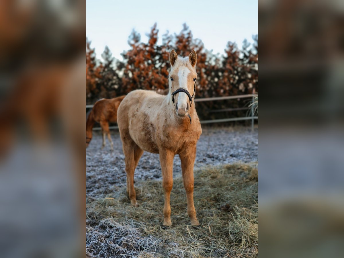 Klaczka urodzona na początku czerwca tego roku, docelowo +/- 160 cm, pełne pochodzenie po ogierze Kiss of Gold, paszport AES, nauczona chodzenia na uwiązie, przywiązana grzecznie stoi, bezproblemowa przy czyszczeniu, kowalu czy weterynarzu, szczepiona i odrobaczana, bardzo kontaktowa, chętnie idzie do człowieka, super charakter. Sprzedaż ze względu na redukcję stada :)
