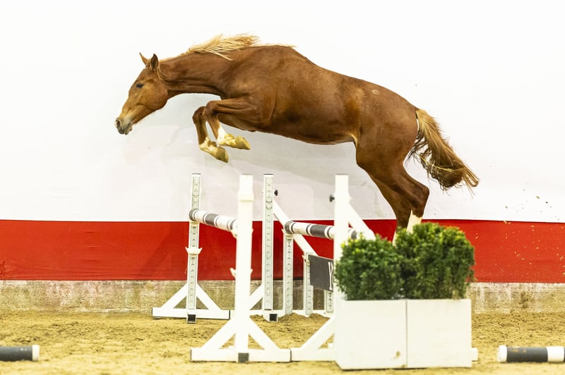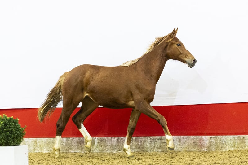 A very distinctive mare with her striking blonde mane. She immediately stands out in type and presence. Beautifully long-lined, modern in conformation and very light-footed in her movement. She has a big, ground-covering canter, is quick off the ground and shows excellent hind leg technique. In her movement she demonstrates an active hind leg and natural balance. A modern sport type with quality and attitude. From the same dam, two embryo offspring are currently successfully competing in sport. The dam herself was a very promising young horse but entered breeding after an accident. Her offspring are already competing at 1.40m level at seven years of age. This makes this mare not only sport-wise interesting, but also extremely valuable for breeding.