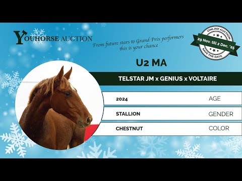 Jaarlinghengst U2 MA draaft goed, heeft een zeer goede galop en een sterke motor in de achterhand. Vader is Telstar JM TN (Ermitage Kalone), een zesjarige hengst die afkomstig is uit de stam van Jus de Pomme en O’Bailey van het Brouwershof. Moeder Kyra Bella stamt af van Genius, een kleinzoon van de bekende Audi’s Jikke (1.60m Grand Prix). Grootmoeder Odessa Bella (Voltaire), volle zus van de 1.60m Grand Prix paarden Hallo Hallo en Play It Again, behaalde de predikaten elite en preferent. Ze gaf onder meer de elitemerrie Vika Bella (1.35m springen en moeder van het 1.45m springpaard Loeki). Uit dezelfde lijn komt de AES en NRPS goedgekeurde hengst Zeppe Blue (1.55m Grand Prix).