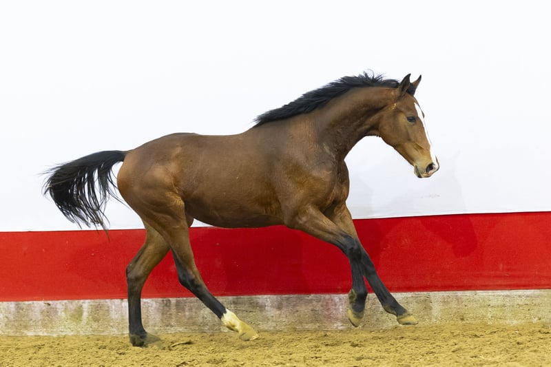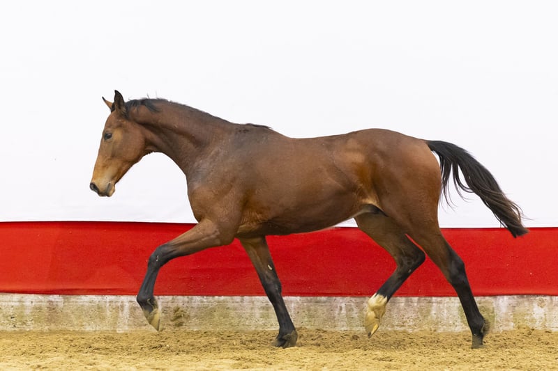 A highly interesting mare with strong blood expression. She is very light-footed and canters like a thoroughbred. Her canter is uphill, balanced and easy to adjust. She moves well and naturally stays in balance. Towards the fence she keeps overview and maintains her rhythm. She jumps with a beautiful technique and an excellent bascule. Her hindleg technique is strong and she shows plenty of scope. She uses her body correctly and finishes the jump in a very good way. In our opinion she is interesting for showjumping due to her canter, lightness and mindset. Additionally, she is interesting for breeding.
