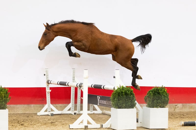 Wat een prachtig type en check zijn goede techniek van springen. De tweejarige Hello Henrie wil voorzichtig zijn en kan goed bewegen. Zijn zevenjarige halfzus Vorselina springt op 1.30m niveau. Zijn volle broer Veldstar is eveneens te koop in deze veiling. Vader is de 8-jarige AES-hengst His Pleasure Duborget, halfbroer van drie 1.50m en vijf 1.40-1.45m springpaarden en gefokt uit de halfzus van de 1.60m Grand Prix hengsten Rahotep de Toscane en Jadis de Toscane. Moeder Godelief stamt af van Bustique, net als Maikel van der Vleuten’s toppaard Beauville en is een halfzus van een 1.30m springpaard. Grootmoeder Promise voert de waardevolle genen van Concorde x Le Mexico x Almé en is een halfzus van de hengst Billy Mexico (1.70m Grand Prix met William Funnell) en Panama (1.60m Grand Prix).