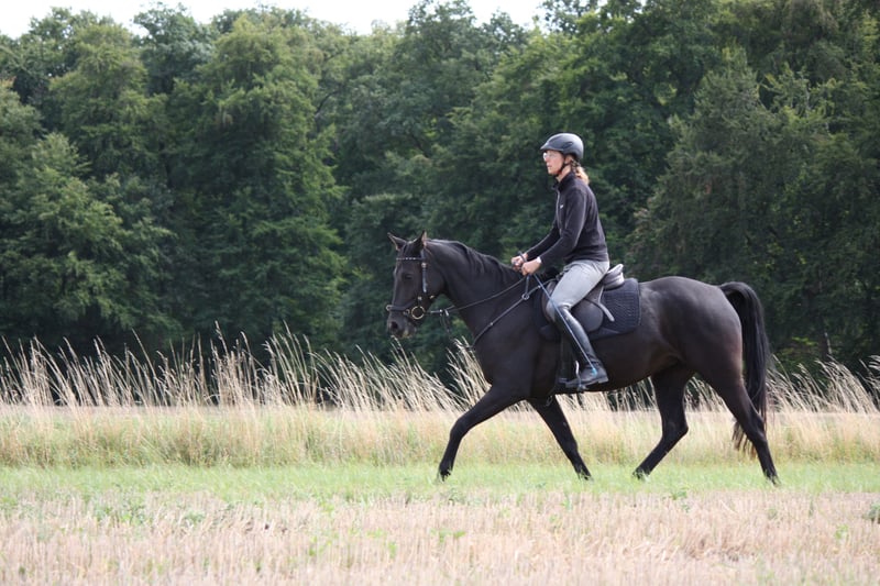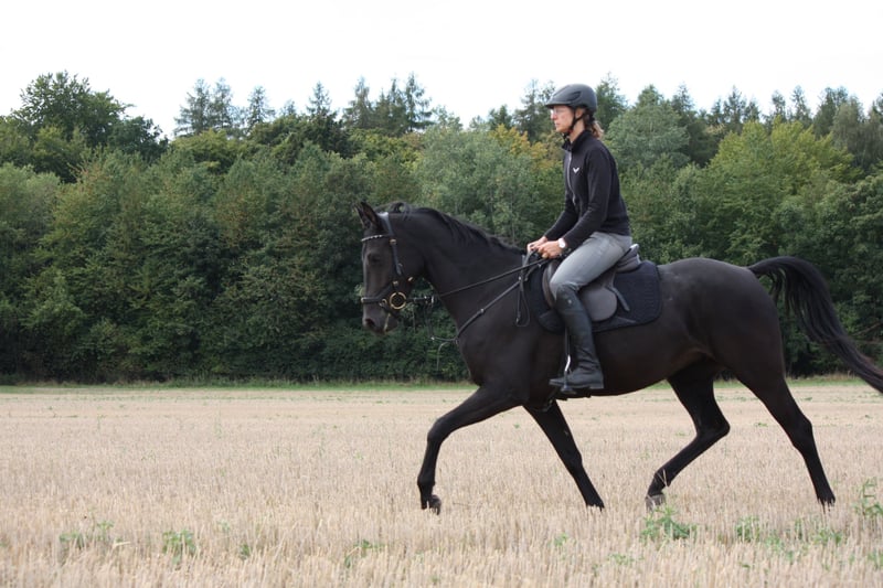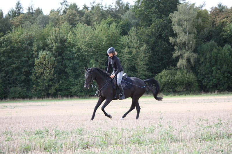 (Reiterin auf Fotos ist 1,75m) Galina hat sich über den Sommer toll entwickelt und spielt auch mal bei weniger routinierten Reitern gut mit. Kleine Hindernisse absolviert sie routiniert und im Gelände ließ sie sich zu Hause und auf kleinen Ausflügen gut regulieren und ging mutig beispielsweise auch an Spargel-Erntemaschinen, zwischen Folie-bedeckten Feldern, vorbei. Sie geht eifrig auf den Hänger bleibt beim Putzen und Aufsitzen brav stehen und kann jetzt mit gutem Gefühl abgegeben werden. Ausgestattet mit drei wirklich guten Grundgangarten (v. a. Schritt und Galopp!), ist Galina super bequem zu sitzen, immer sehr bewegungsfreudig und begierig darauf zu lernen (Reaktion auf Touchieren, Seitengänge, Übergänge etc.). Bei uns stand sie nur nachts in der Box und tagsüber mit anderen Pferden in Ausläufen oder auf der Weide. Galina wäre aufgrund ihrer Abstammung auch für die Zucht sehr interessant. Sie ist ein seltener Nachkommen von Midas. Für jede Frage stehe ich gerne zur Verfügung.