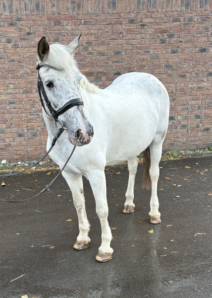 Pinta is a strikingly marked 11-year-old mare with a passport. She stands approximately 1.55 meters tall and has a sturdy build. She is used in our riding school both on the lunge line for beginners and more advanced riders. She is social with other horses and is accustomed to both box and open stall housing. Currently, she has four shoes but can also go barefoot. She is familiar with riding out and riding with side reins. Pinta offers a comfortable seat and is always easy to get moving. No health issues are known. Tack can be purchased separately for an additional fee.