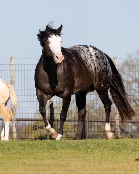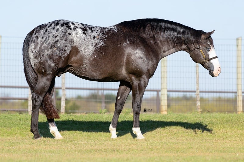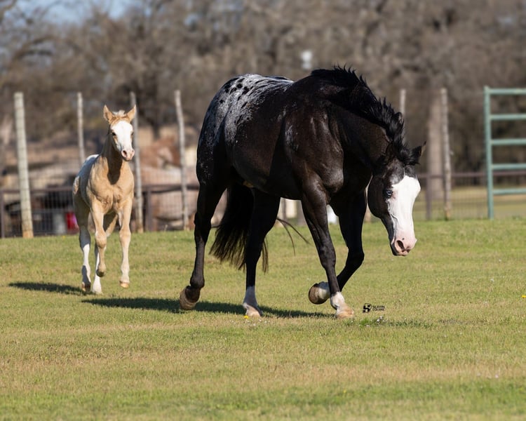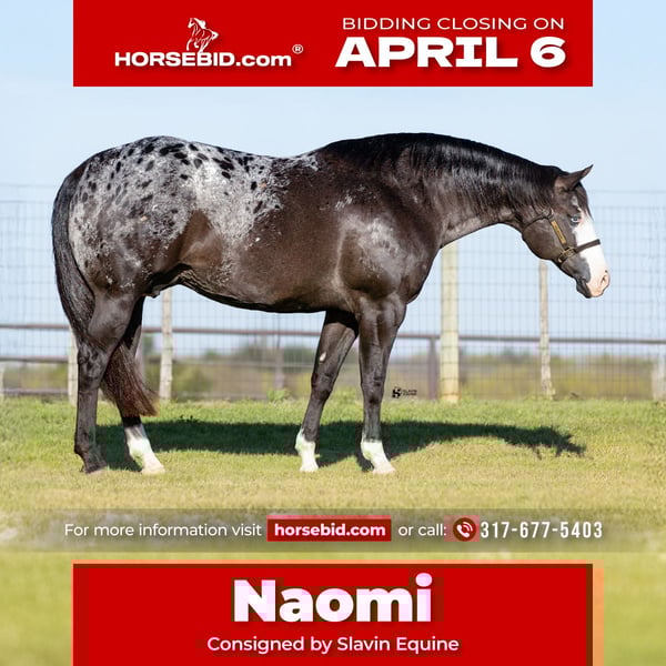 🌟𝑨𝒑𝒓𝒊𝒍 𝐀𝐋𝐋 𝐒𝐓𝐀𝐑 𝐋𝐈𝐍𝐄𝐔𝐏🌟 Happening now thru MONDAY | APRIL 6th - Available EXCLUSIVELY on HorseBid's website! For more details and to register visit: www.Horsebid.com CONSIGNOR CONTACT: Slavin Equine 317-677-5403 LOCATION: Whitesboro, TX BREED: ApHC REGISTERED: Yes REGISTERED NAME: Rewarded In Jewels COLOR: Black Appaloosa HEIGHT: 16.1 AGE: 12 GENDER: Mare If you’re looking for a mare that combines beauty, presence, and personality, Naomi is sure to impress. With her dark, smoky coat, bold bald face, striking blue eyes, and a big, beautiful blanket, she is nothing short of stunning! Naomi is the kind that instantly turns heads wherever she goes. A registered ApHC mare, sired by Brokers Reward and bred by the legendary Iron Horse Ranch, she is a true reflection of elite quality and proven consistency. This is a big, shapely mare with substance and balance, paired with a professional, easygoing attitude that makes her a pleasure to have in any barn. But Naomi offers far more than just looks—she has an exceptional personality to match. She is incredibly kind, gentle, and people-oriented, thriving on attention and affection. Her sweet nature truly sets her apart, and she has proven herself to be an outstanding mother. At her side is her 2026 ApHC palomino colt, “Johnny,” a standout in his own right. Born February 13th, and sired by the accomplished Tru Legacy (earner of $13,000+ and 3-Time Reserve World Champion), Johnny is already displaying excellent conformation, a kind eye, and a willing disposition. With his white face, four white socks, and bold blanket, he is sure to turn heads wherever he goes. He has begun halter breaking and has been straightforward and eager to learn every step of the way. Naomi has been confirmed in foal to The Last E, with a last breeding date of February 23, 2026, and an expected due date of January 29, 2027. Palpation videos are available in the gallery above. This offering is a true 3-in-1 opportunity: * Naomi (proven, quality mare) * Her 2026 palomino colt at side * Foal in utero by The Last E (2x AQHA World Champion, 5-panel N/N) All paperwork is complete and in perfect order for the mare, the colt, and the foal in utero. We are happy to assist with shipping anywhere in the United States or even internationally! Naomi and her sister Wynona have been together long-term and get along exceptionally well, as do their foals. While they would happily transition to a new home together, Naomi is adaptable and integrates easily with other mares. Come visit us in Whitesboro, Texas, and see for yourself why this stunning, sweet mare and her standout colt leave such a lasting impression. For more information, contact Parker at 317-677-5403.
