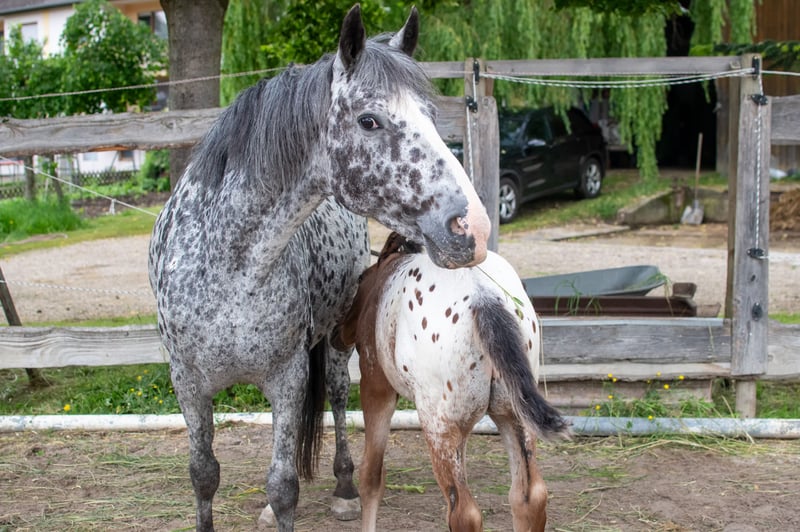 Kates a Star, known as Kati, is a descendant of "Toby 1", thus coming from the famous Toby line. She was always ridden during the time she was not heavily pregnant and did not have a foal at her side. Kate is an excellent mother and is now pregnant again by Buns Final Chief. Her last foal (see pictures) is a buckskin; before that, she had a bay and prior to that, a pinto. She passes on color - depending on the stallion. She has very good hooves, is farrier-friendly and loading-friendly, and is very pleasant to handle. Based on my experiences with her groundwork, I can say that she is smart, learns quickly, and is cooperative. I must part with her due to age and health reasons and will only place her in a good home. During the time she has been with me, Kate has never had any issues; this also applies to foaling and her foals (happy to provide a call with her veterinarian).