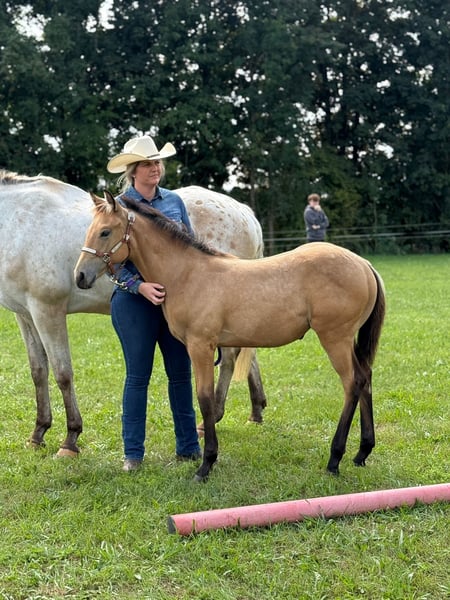 **For Sale: Appaloosa Mare** For sale is a beautiful Appaloosa mare, born in 2025. With a height of 152 cm, she is the ideal partner for Western riders looking for a versatile and strong-willed horse. This mare is characterized by her friendly nature and willingness to learn. She is well-trained and always eager to please. Her striking coat pattern makes her a real eye-catcher. She is suitable for both leisure riding and competition, and is of course also very interesting for breeding. If you are interested or need more information, please feel free to contact me. Plaudit San Molly (LG 1 awarded) Approx. 152 cm Sire: Cowboys Spoted San Dam: Charmys Purple Rose Color: Chestnut/white Peppys Golden Belle (LG 2 awarded) Approx. 158 cm Sire: Cowboys Spoted San Dam: Sheza Mithy Nikita Color: Buckskin Both foals are 5 Panel double NEGATIVE through the parentage. Price per foal!!! Just send me a message!