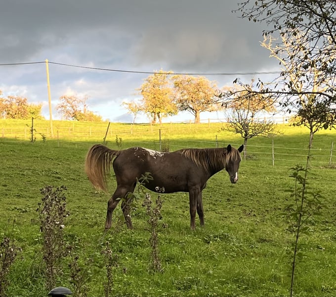 Aussergewöhnliche Walkalloosa-Jungstute (Rockmountain Horse/Appaloosa) mit Gangveranlagung Dmrt3-Tölt-Gen zu verkaufen, im März 4 Jahre alt. Adsila ist im Herdenverband aufgewachsen, Ausbildung am Boden: nach Tellington und Grundkenntnisse Horsemanship; ging häufig ins Gelände als Handpferd, Barhuftrimming. Sie ist sehr gut gebaut und hat schöne, schwungvolle Gänge, Minipanel Genetic Test. Sie kommt nun in professionellen Beritt oder falls die zukünftige Käuferschaft dies selber tun möchte, wäre dies auch eine Option. Nur in absolut gute Hände wegen Bestandesverkleinerung und Aufgabe der Zucht abzugeben. Walkalloosa: RockymountainHorse/Appaloosa Kostenpunkt: Euro 9'500 - 14'500..--, je nach Ausbildungsstand, Standort Lörrach