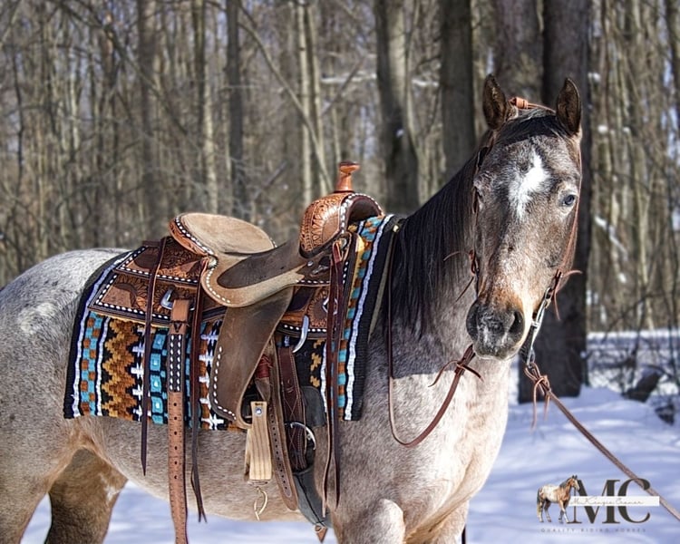 ℳ𝒶𝓇𝒸𝒽 ♦️𝐑𝐈𝐃𝐄𝐑'𝐒 𝐂𝐇𝐎𝐈𝐂𝐄♦️ Happening now thru MONDAY | MARCH 9th - Available EXCLUSIVELY on HorseBid's website! For more details and to register visit: www.Horsebid.com CONSIGNOR CONTACT: MC Quality Riding Horses 330-307-0323 LOCATION: North Bloomfield, OH BREED: Appaloosa REGISTERED: No REGISTERED NAME: Mocha COLOR: Bay Roan HEIGHT: 14.2 AGE: 8 GENDER: Mare Mocha is an 8-year-old grade Appaloosa mare standing 14.2 hands. She’s confident, seasoned, and takes care of her rider every step of the way. Mocha is a true point and go horse with zero spook. She’s been ridden straight from the house, through town, around traffic and farm equipment, and even to the lake where she absolutely loves the water. She has also been used to gather cattle out in Nebraska and has proven to be calm, reliable, and handy in real world working situations. She loves arena work and is incredibly smooth to ride. Mocha picks up both leads effortlessly, has a very soft mouth, and is extremely responsive to cues. She moves along at a comfortable, medium-soft pace that you can ride for hours. Mocha has been ridden English and Western and has been started over cross rails with zero hesitation. She will go wherever she’s pointed. She’s confident, and willing. Mocha loves to have a job. This mare is an absolute sweetheart and loves kids. She’s kind, patient, and safe, making her suitable for any level of rider, from beginners to more experienced riders wanting a trustworthy partner. On the ground, she’s easy to handle, stands quietly for grooming and tacking, and is a pleasure to be around. Mocha has been exposed to cows, farm animals, traffic, noise, and new environments, making her an excellent choice for a family horse, trail rider, arena rider, trail obstacle, or lower-level English prospect. She is barefoot, an extremely easy keeper, and 100% sound - the kind you can enjoy without extra maintenance or surprises. Shipping can be arranged anywhere in the U.S. Please do not hesitate to reach out to McKenzie with any questions!