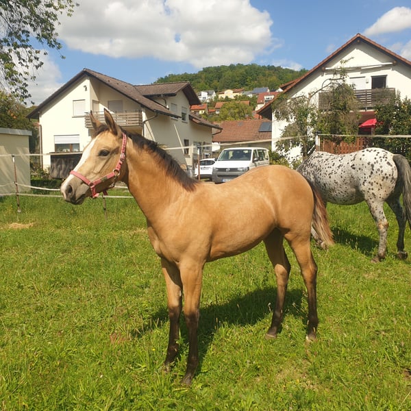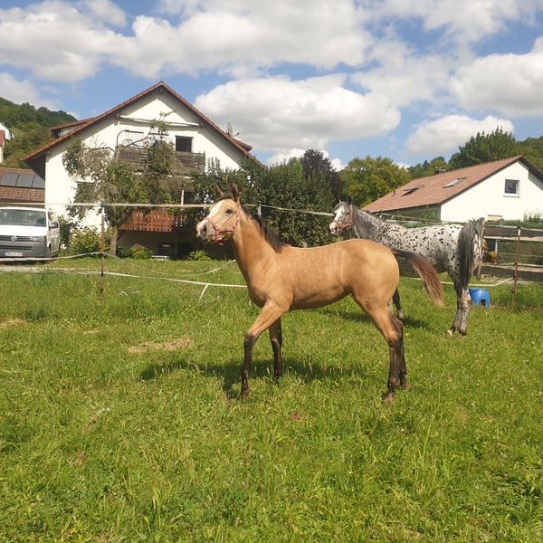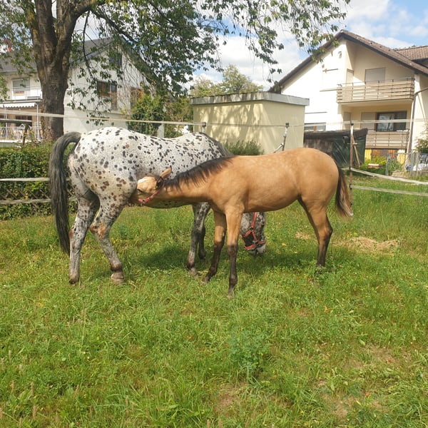 Nikita of Mamansco is not only stunning with her black overreach boots, but she also captivates with her affectionate nature. A foal that has never kicked out. Niki has the urge to come to people and does not feel restricted; she loves to be held. When haltering or putting on a fly mask, she stands still like a 15-year-old, making her wonderful to handle. We are also regularly practicing lifting her legs; with each session, you can see the progress, which shows me how trainable Niki is. Niki will receive US papers and is 90% FPD, meaning she has a high percentage of Appaloosa blood. We have already conducted a 5-panel test from a laboratory to document that Niki is free from the typical diseases that Appaloosas are prone to. Nikita of Mamansco is strongly influenced by the famous "Toby line." Toby descendants are present multiple times in her maternal lineage. What affects all our horses is the daily relatively intensive handling: haltering and walking over 500 meters to the pasture along a busy road is one example. Many things are already second nature to Niki: "What little Hans has learned, big Hans does not have to be taught painstakingly later" :-)