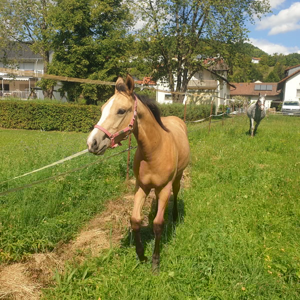 Nikita de Mamansco no solo es hermosa con sus medias altas negras, sino que también destaca por su cercanía a las personas. Es un potro que nunca ha pateado. Niki tiene el impulso de acercarse a los humanos y no se siente restringida, sino que le encanta ser abrazada. Al ponerle la cabezada o el protector de orejas, se queda quieta como una adolescente de 15 años, por lo que es maravillosa en el manejo. También estamos practicando regularmente el dar las patas; con cada vez se puede notar el progreso y eso me muestra cuán capaz de aprender es Niki. Niki recibirá documentos estadounidenses y es FPD 90%, por lo que tiene un alto porcentaje de sangre Appaloosa. Ya hemos realizado una prueba de 5 paneles en un laboratorio para documentar que Niki está libre de las enfermedades típicas a las que son propensos los Appaloosas. Nikita de Mamansco está fuertemente influenciada por la famosa "línea Toby". Hay varios descendientes de Toby en la línea materna. Lo que afecta a todos nuestros caballos es el trato diario relativamente intenso con ellos: ponerles la cabezada y caminar más de 500 metros hacia el prado por una carretera transitada, es un ejemplo. Muchas cosas ya son evidentes para Niki: "Lo que Hansel ya ha aprendido, no hay que enseñárselo a Hans con dificultad más tarde" :-)