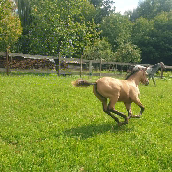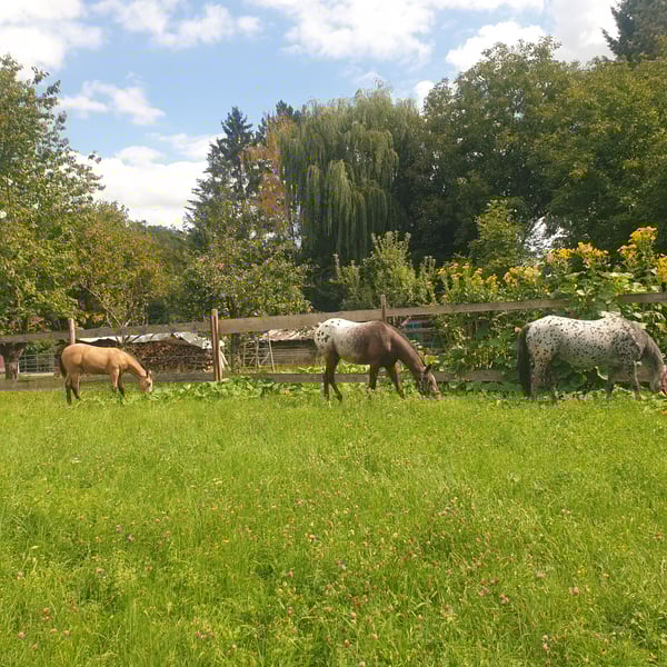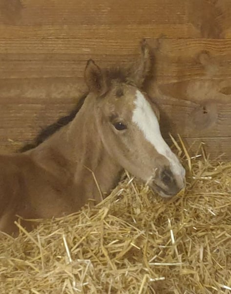 Nikita de Mamansco n'est pas seulement magnifique avec ses cuissardes noires, mais elle se distingue également par son attachement aux humains. Un poulain qui n'a jamais donné de coups de pied. Niki a le besoin de s'approcher des gens et ne se sent pas à l'étroit, elle adore être prise dans les bras. Lorsqu'on lui met le licol ou le bonnet anti-mouches, elle reste immobile comme une jument de 15 ans, donc elle est merveilleuse à manipuler. Nous pratiquons déjà régulièrement le fait de lever les jambes ; à chaque fois, on peut constater les progrès, ce qui montre à quel point Niki est capable d'apprendre. Niki recevra des papiers américains et est FPD à 90 %, donc avec une forte proportion de sang Appaloosa. Nous avons déjà fait réaliser un test 5-panel dans un laboratoire pour pouvoir documenter que Niki est exempte des maladies typiques auxquelles les Appaloosas sont sujets. Nikita de Mamansco est fortement influencée par la célèbre "lignée Toby". Les descendants de Toby sont présents plusieurs fois dans la lignée maternelle. Ce qui influence tous nos chevaux, c'est le contact quotidien relativement intensif que nous avons avec eux : mettre le licol et marcher plus de 500 m jusqu'au pré sur une route fréquentée, par exemple. Beaucoup de choses sont donc déjà évidentes pour Niki : "Ce que Hansel a déjà appris, il n'est pas nécessaire d'apprendre laborieusement à Hans plus tard" :-)