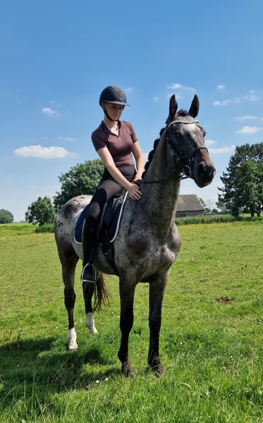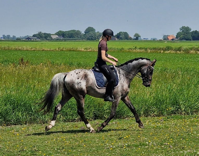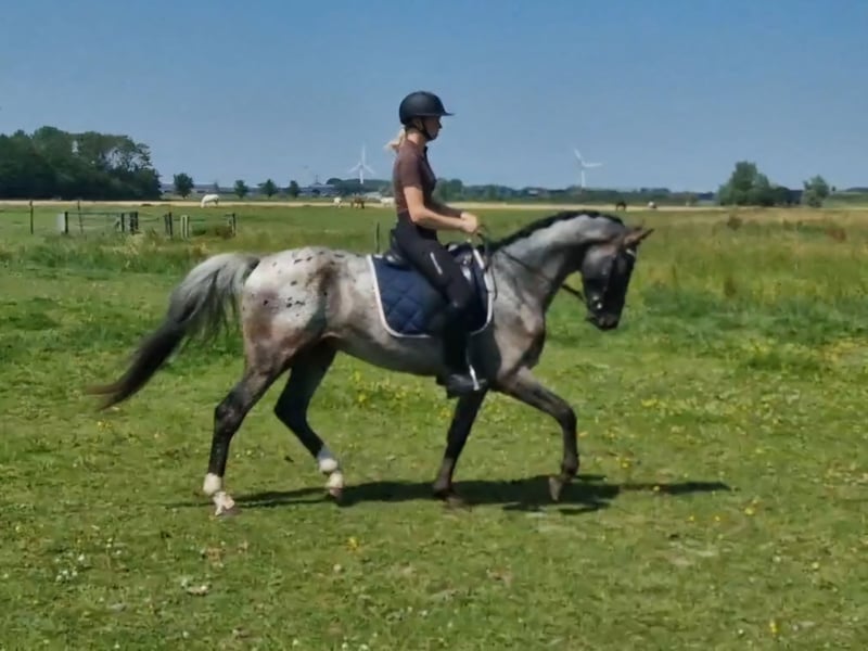 This appaloosa bred by ourselves is a special appearance. With his different color and very fine and smooth spacious movement. Is finely trained and easy to ride. Is still a stallion, but easy to handle, well behaved, very sweet and people-oriented. Wants to work for you! Bred from very fine dressage bloodlines. Sire is the 1st premium Keur and Prestatie Sport Peru's First Class, also Dutch Champion. Mother has obtained the Sport predicate. In the dressage bloodlines the very proven famous stallions Krack C, Jazz and Sir Donnerhall. And that combined with appaloosa blood what gives him this beautiful shiny color. For a change we also did some jumping, he likes this too. Which can also make him a suitable all-rounder. Has always had a lot of free movement and been in group rearing. Never had any defects or injuries. Falls in higher price category. Please contact us if interested.