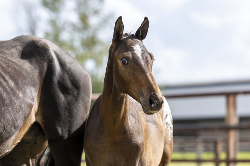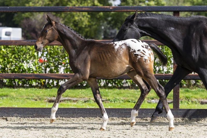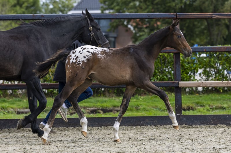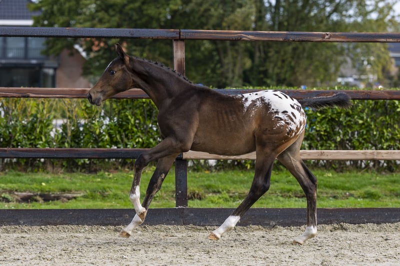 Color is popular! What do you think of this striking I Run This with his four white feet, beautiful coat and elegant appearance. He already steals the show. Sire is the six-year-old pinto stallion Ohio de Peru (1.20m), a son of the 1.60m Grand Prix stallion Con-Cor. Dam Furie d’Harreville is, through the stallion Dandy du Marais II, a granddaughter of the influential Le Tot de Semilly. This French damine goes back to Diamantine Denehou (Muguet du Manoir), dam of Ondine Balmaniere (1.55m Grand Prix with Melanie Cloarec) and a 1.30m level showjumping horse.