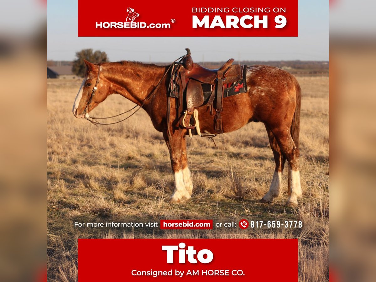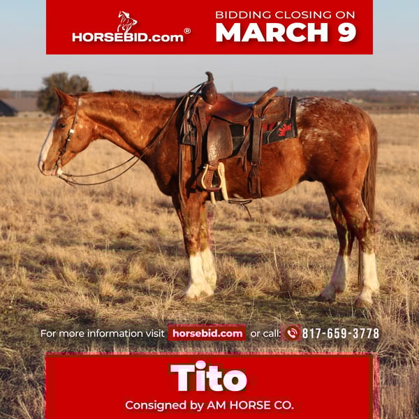ℳ𝒶𝓇𝒸𝒽 ♦️𝐑𝐈𝐃𝐄𝐑'𝐒 𝐂𝐇𝐎𝐈𝐂𝐄♦️ Happening now thru MONDAY | MARCH 9th - Available EXCLUSIVELY on HorseBid's website! For more details and to register visit: www.Horsebid.com CONSIGNOR CONTACT: AM HORSE CO. 817-659-3778 LOCATION: Mineral Wells, TX BREED: Appaloosa REGISTERED: No REGISTERED NAME: Tito COLOR: Appaloosa HEIGHT: 14.3 AGE: 14 GENDER: Gelding 🍸Tito🍸 Who doesn’t want a cool Appaloosa standing in their pasture?! 🔆BROKE, GENTLE, AND ADORABLE 〽️A horse that is handy enough to do any job or anything you ask of him? 🔆The ultimate family horse that they can have hours of fun with! 〽️That versatile gelding that you can ride anywhere! 🔆A perfect gelding to ride down the trails all day long without any trouble whatsoever? 〽️A great lesson horse, drill team? Maybe a sorter or to go ranch on? Tito IS a BEEN THERE, DONE THAT kinda guy every single one of you looking need to check out! Tito’s is GRADE 14 years old, a perfect age, 14.3 hands tall! He is put together correctly and if he even checks one of the boxes mentioned for you, I encourage you to please check him out! He is as gentle as a puppy and he’s one of the quietest horses we’ve been around! He is one of those all around geldings that are forgiving enough for those complete beginner riders but he is also fun for an advanced! You can’t go wrong with him for your family! Tito is very easy, he walks, trots, lopes and side passes very well! He has the cutest slow trot on a loose rein and will do it all day! He crosses and goes through water like a seasoned pro, he climbs up and down anything you point him too. He does not mind rocky terrain and will go all day long. This horse has no spook to him, what’s so ever, NOTHING phases him. He is guaranteed to keep you safe no matter what, he rides alone or in a group, never buddy sour or barn sour. We can’t say enough good things about him, and believe it or not, there is NOT one bad thing we could say. He is a nice ranch horse, the very best trail horse and the perfect addition to your family. I could talk about him all day long, or you could come see him for yourself! We are located in 🔱Mineral Wells Texas🔱 but have reputable haulers that go all over the country, including Hawaii, Canada, ETC. Give me a call or text and I’d be happy to answer any questions! 817-659-3778