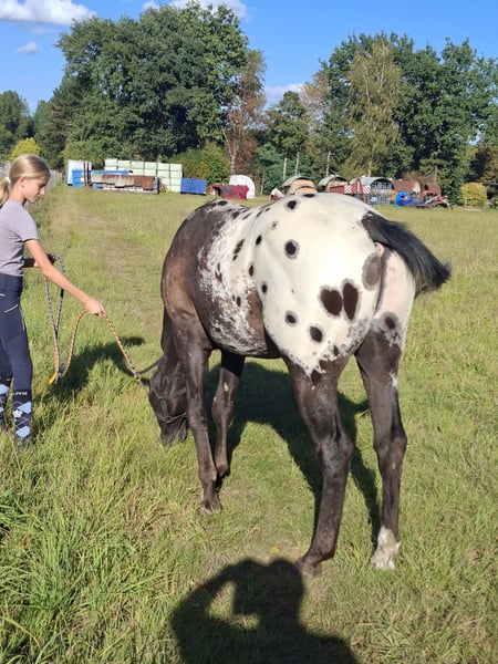 Ce hongre a un caractère très doux et est tourné vers l'homme. Il est magnifiquement construit et superbement tacheté. 5 panneaux N/N Il a 2,5 ans et est prêt à être débourré.