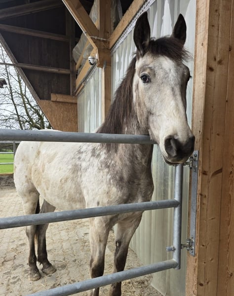 Lewis of Steepy Hillock est un Appaloosa en robe spéciale Buckskin, doté d'une crinière et d'une queue abondantes, ainsi que d'excellentes dispositions. Sa propriétaire actuelle l'a habitué à diverses situations quotidiennes : il maîtrise bien sûr le vocabulaire de base pour un poulain, connaît tous les engins agricoles et de construction, se laisse attacher, brosser et ferrer sans problème. Son plus grand atout : il est très amical avec les enfants ! De plus, il a déjà porté un tapis avec un girth et connaît les promenades en village, même seul. Lewis est très calme pour son âge, possède beaucoup de potentiel et est à un âge idéal pour continuer à progresser. Bien sûr, il peut aussi être un peu malin — quel hongre de son âge n’est pas un peu rusé ? Lewis descend de notre magnifique jument de reproduction Topas, qui a transmis à tous ses poulains un caractère extrêmement gentil : douce, proche de l’humain, câline, bien élevé, avec un tempérament agréable et une grande facilité d’apprentissage. Un frère de Lewis, déjà monté, est également devenu un merveilleux cheval de famille. Il a été vendu en tant que poulain à l’éleveur, puis a passé environ un an dans un grand pré à poulains avant d’intégrer le box privé de sa propriétaire actuelle. Malheureusement, et à contrecoeur, elle doit s’en séparer pour des raisons de santé. En tant qu’éleveurs de Lewis, nous l’aidons à trouver de nouveaux propriétaires qui sauront apprécier ce magnifique jeune cheval en pleine santé. Nous sommes donc, dans ce cas, des intermédiaires, et non des vendeurs. Pour Lewis, nous souhaitons une famille qui lui offrira un vrai foyer et des personnes appréciant ce jeune cheval solide et en pleine forme. Son âge, ainsi que sa socialisation attentive durant la phase de poulain et de jeune cheval, sont des atouts majeurs pour ce beau poulain en robe Appaloosa. Vous cherchez un jeune cheval fiable, joli et au caractère irréprochable ? Votre recherche s’arrête ici ! Contactez-nous pour organiser une visite. Le cheval se trouve en Suisse orientale. Pour plus d’informations sur notre élevage d’Appaloosas et la mère de Lewis, visitez notre site web felihof.ch. Nous élevons des Appaloosas de fondation — Lewis est donc un véritable cheval indien !