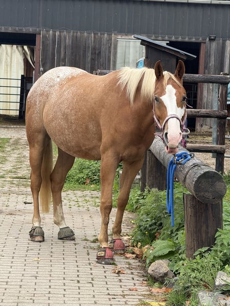 Sehr schweren Herzens muss ich mich aus privaten Gründen von meinem 5-jährigen Appaloosa-Wallach trennen. Er ist ein toller, lernwilliger Kerl mit liebenswertem Charakter. Steht im Offenstall - sehr sozial und rangniedrig. Leichtfuttrig, verschmust und ein ganz gemütlicher braver Kerl. Wird gerade Richtung Reining trainiert, fliegende Wechsel angefangen. Natürlich auch für andere Disziplinen wie Ranch oder Trail geeignet:) oder Freizeitpartner Unterm Sattel zeigt er sich gut geritten und zuverlässig. Im Gelände sowohl alleine als auch in der Gruppe stets brav. Gelegentlich ist er ein wenig frech, aber nie böse, vielmehr neugierig. Mit seiner schnellen Auffassungsgabe bin ich überzeugt, dass in ihm noch viel Potenzial steckt, das es man fördern kann. Er hat bisher keinerlei Krankheiten gehabt, auch keine Koliken etc. Er hat außerhalb der Schlauchtasche 2 kleine Warzen, die ihn aber in keinerlei Hinsicht beeinträchtigen. Am Röhrbein hat er eine Narbe seit Fohlenalter, diese ist von mir geröntgt wurden und vom Tierarzt als Schönheitsfehler eingestuft. Röntgenbilder können geneigt werden. Diese beeinträchtigt ihn in nicht bei der Belastung. Ca. 1,53-54cm Stockmaß Videos können auch gern geschickt werden! Sattel kann gegen Aufpreis gerne erworben werden. Er eignet sich für ambitionierte Freizeitreiter/innen, die Freude daran haben, mit einem jungen Pferd weiter zu arbeiten und gemeinsam zu wachsen Gerne per WhatsApp schreiben