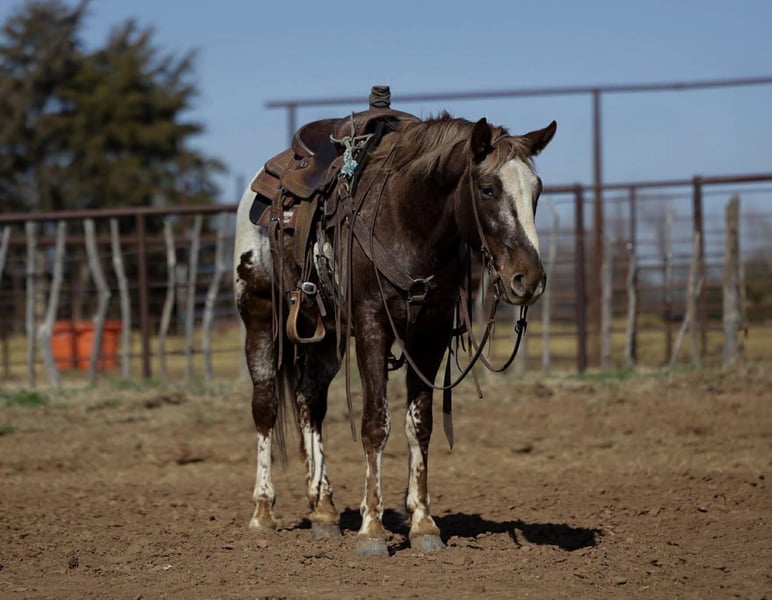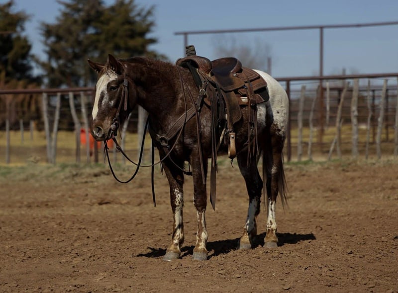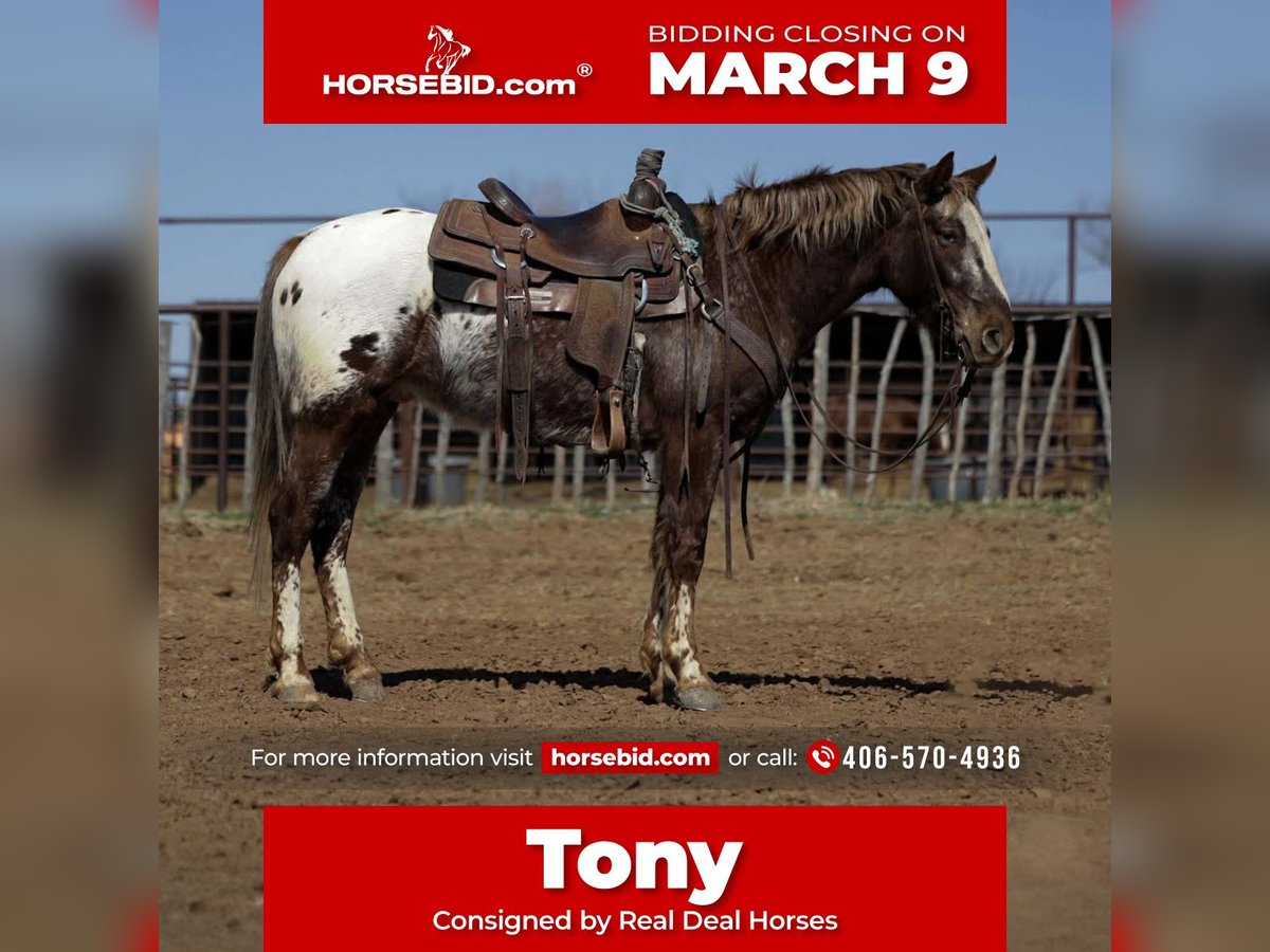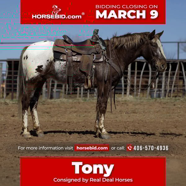 ℳ𝒶𝓇𝒸𝒽 ♦️𝐑𝐈𝐃𝐄𝐑'𝐒 𝐂𝐇𝐎𝐈𝐂𝐄♦️ Happening now thru MONDAY | MARCH 9th - Available EXCLUSIVELY on HorseBid's website! For more details and to register visit: www.Horsebid.com CONSIGNOR CONTACT: Real Deal Horses 406-570-4936 LOCATION: Ripley, OK BREED: Appaloosa REGISTERED: No REGISTERED NAME: Tony COLOR: Chestnut HEIGHT: 14.1 AGE: 6 GENDER: Gelding Tony is a 14.1 hand Appaloosa gelding with the coolest markings! Eye catching leg patterns and those big polka dots across his hip that make him stand out in any crowd. He’s a handsome, well built gelding. Tony is gentle, quiet, and extremely willing. He’s been ridden extensively on the trails, through town and traffic, and around dogs, goats, and pigs. Tony is a handle tool on the ranch. Sorting, gathering, roping, doctoring, you name it. Will side pass beautifully to open and shut gates, has a nice one hand neck rein, and the cutest rocking chair lope you’ve ever seen. Stands patiently for the farrier, and is great to saddle, tie, load, and bathe. He has excellent ground manners and is truly a pleasure to have around the barn. He’s not chargy, he’ll step up and go to work when asked, or slow down and take care of someone who’s still learning. He’s confident with tarps, ropes, balls, and all the “circus” activities. Whether you’re looking for a dependable ranch horse, trail partner, 4H mount, rope or gymkhana prospect, Tony is the kind that checks the boxes. Don’t miss out on this good minded, versatile gelding. Call Trevor at 406-570-4936 to schedule a time to come ride him or arrange a PPE, Nationwide transportation can be arranged.