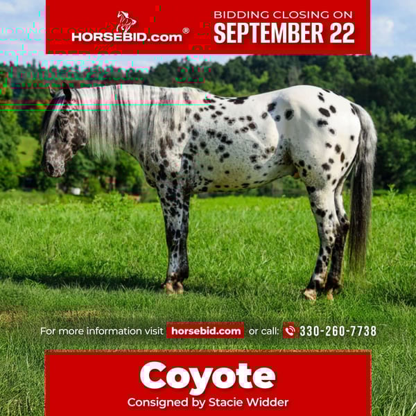 🍁𝒕𝒉𝒆 𝐅𝐀𝐋𝐋 𝑺𝒑𝒆𝒄𝒕𝒂𝒄𝒖𝒍𝒂𝒓🍁 Happening now thru MONDAY | SEPTEMBER 22nd - Available EXCLUSIVELY on HorseBid's website! For more details and to register visit: www.Horsebid.com CONSIGNOR CONTACT: Stacie Widder 330-260-7738 LOCATION: Salesville, OH BREED: Appaloosa REGISTERED: Yes REGISTERED NAME: DSK Coyote Moon Echo COLOR: Leopard Appaloosa HEIGHT: 15 AGE: 5 GENDER: Gelding Stand Out with Coyote! If you're looking for a horse that turns heads everywhere you go, look no further. DSK Coyote Moon Echo, or "Coyote," is a showstopper. This 2020 registered leopard Appaloosa gelding is more than just a pretty face; he’s an absolute unicorn. Standing at a solid 15 hands with a stocky build, Coyote has been a cherished part of our family since he was three years old. He has not been passed around; instead, we have spent countless hours making sure he's a reliable and solid mount, ready to find his forever home. Coyote has been hauled to many different events and rodeos, where he has carried the flag and ridden in grand entries. He is always the center of attention and loves all the affection he gets. Coyote is incredibly steady and kind under saddle, even for the most inexperienced riders. In fact, he has been ridden by small, beginner children with the utmost patience. This versatile gelding is skilled both in and out of the arena. He handles trail obstacles with ease and has been used to push cattle and has been roped off of lightly in the pasture. Coyote is a sure footed and confident trail partner in a group or alone. Whether you want a partner for the show pen, a steady trail companion, or a horse to take in any direction, Coyote is up for the job. He is truly the easiest horse to have around. He's easy to keep, has great feet, and is a breeze to catch and load. Coyote has no flaws and is a real-life unicorn. Don't miss your chance to own this one-of-a-kind gelding.