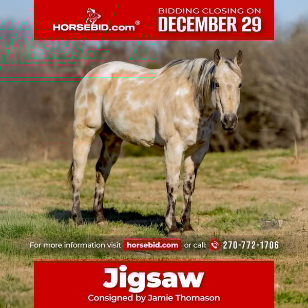 ⚜️ 𝓗𝓮𝓻𝓲𝓽𝓪𝓰𝓮 𝐖𝐢𝐧𝐭𝐞𝐫 𝓒𝓵𝓪𝓼𝓼𝓲𝓬⚜️ Happening now thru MONDAY | DECEMBER 29th - Available EXCLUSIVELY on HorseBid's website! For more details and to register visit: www.Horsebid.com CONSIGNOR CONTACT: Jamie Thomason 270-772-1706 LOCATION: Auburn, KY BREED: Appaloosa REGISTERED: No COLOR: Buckskin HEIGHT: 14.3 AGE: 6 GENDER: Gelding A horse that truly stands out! JIGSAW is unique, honest, and the kind you can rely on every single day. A genuine family horse and a trusted best friend! Suitable for kids yet fun and enjoyable for adults. Jigsaw is a 6 yr old, Buckskin Appaloosa gelding that stands a rider-friendly 14.3 hands. He offers a calm, quiet, and confident ride that makes him easy to enjoy for all levels of riders. Jigsaw is experienced on the trail and is the definition of point and go, confidently crossing water, stepping over downfall, and navigating rough, uneven terrain with a sure-footed stride. He’s my “go to horse” for an enjoyable ride. Does well in a group or is perfectly content exploring the countryside alone. Jigsaw is uncomplicated under saddle, tolerant of mixed cues, and forgiving of inexperienced riders, making him a horse you can trust day after day. In the barn, his personable nature truly shines, he loves kids, enjoys grooming, and is simply pleasant to be around. Jigsaw is not just easy to ride…. he’s easy to love and a joy to have as part of the family! If you’re interested in meeting Jigsaw, feel free to get in touch. PPEs are welcome, and we’re happy to help coordinate transportation anywhere. Buy with confidence! Jigsaw is a truly exceptional horse and a wonderful addition to any family.