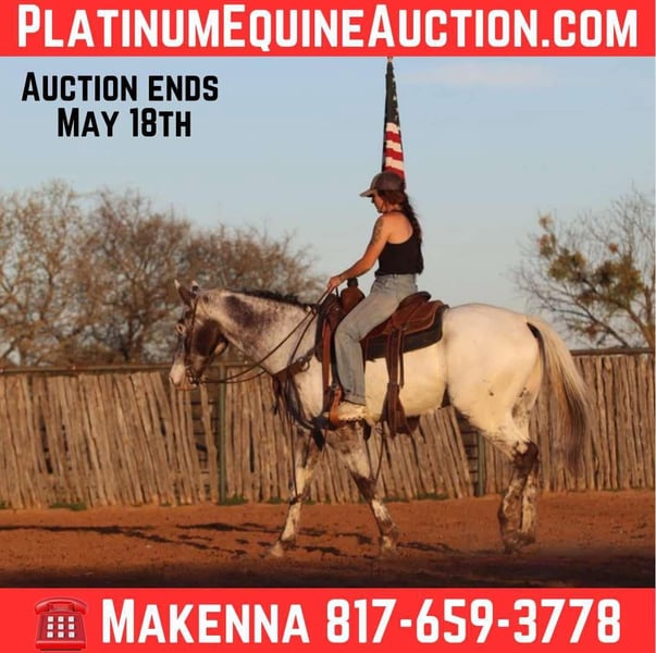 ONLINE AUCTION Place your bids at www.PlatinumEquineAuction.com Starting Bid $3500 Auction ends May 18th, 2025 Need a new saddle? Check out White Rock Saddles on our website or Facebook! Check out this amazing gelding we have had the opportunity to offer to the public, Tip! Tip is an astonishing registered Appaloosa gelding! Just look at his color! At only 7 years old, this gelding is ready to find his forever family! This guy is always eager to do is job. This horse not only looks majestic, but he rides like it too. Walk, trot, lope, this horse moves like a dream. He even rides English! The kind of a horse that you can show off to all of your friends. This is the ultimate gift for any family member, as he is gentle and safe! Tip is well broke, does whatever is asked of him no matter what, he makes it fun! Tip has been shown in numerous ranch pleasure classes, trail classes, etc, and he LOVES the show ring! This is the perfect trail horse, as he doesn’t have a care in the world, loves just to go all day with his person. He rides great in the arena, knows both his leads, has a smooth trot as well! I could write a book about him all day but he speaks for himself! No matter how busy your life may get, Tip is always ready to saddle up and ride off without a care in the world! He will always meet you at the gate, especially with a little cookie interruption. Located in Lipan Texas We can help arrange hauling anywhere in the US, Hawaii or Canada! Please call or text Makenna Hartzell 817-659-3778. ONLINE AUCTION Place your bids at www.PlatinumEquineAuction.com Starting Bid $3500 Auction ends May 18th, 2025 Need a new saddle? Check out White Rock Saddles on our website or Facebook!