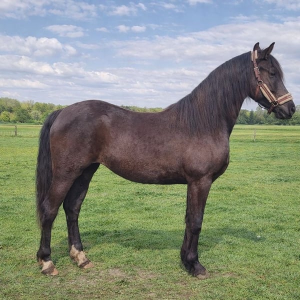 Aura ist eine selbst gezogene 50/50 Kreuzung zwischen einem Araber und einem Friesen, die die perfekte Mischung aus Arbeitswillen, Adel und Kraft vereint. Geburtsdatum: **26. Mai 2024** Farbe: Schwarz mit einem Stern auf der Stirn und zwei weißen Hinterbeinen. Erwartete Stockmaß: ca. 1,65 m (eine schöne Größe für den Sport!) Ein besonders hübsches, ausdrucksstarkes Kopfstück und eine korrekte Bauweise. Aura verfügt über einen sehr interessanten Pass: Vater: Bailando (Saklavi I-CZ x Bagiera), bringt die Feinheit, Ausdauer und Intelligenz des Arabers mit. Mutter: Silke van de Oude Kleefsebaan (Uldrik 457 x Sjoukje van het Schar). Über die Mutterlinie führt sie das beste Friese Sportblut, u.a. von **Dries 421** und **Leffert 306**. Aura ist eine energiegeladene Stute mit einem "An"-Schalter, ist aber gleichzeitig sehr menschenbezogen und brav im Umgang. Sie ist bei uns auf der Zucht aufgewachsen und zeichnet sich durch ein ehrliches Wesen aus. Sie hat den Charme einer schwarzen Perle, jedoch mit der zusätzlichen Länge in den Beinen und der Größe, nach der viele Reiter suchen. Aura ist korrekt geimpft, entwurmt und an den Hufschmied gewöhnt. Sie ist bereit, bei einem neuen Besitzer weiter zu wachsen und sich zu einem wunderschönen Sport- oder Familienpferd zu entwickeln. Für weitere Informationen oder einen Besuch können Sie uns gerne kontaktieren.