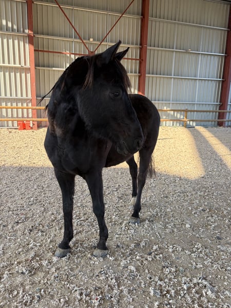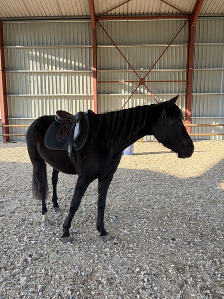 À saisir avant début de saison de concours (Dressage / CSO) Vends superbe hongre Arabo-Frison de 4 ans, robe noire intense, alliant l'élégance du Frison à la rusticité et l'endurance de l'Arabe. Un cheval avec du "chic", très proche de l'homme et doté d'un tempérament exemplaire. 🌟 Points Forts & Aptitudes : • Mental : Très gentil, calme et volontaire. Débourré en début d'année, il montre une grande maturité pour son âge. • Extérieur : Sort seul en extérieur sans aucune hésitation. Un cheval de confiance. • Travail : Commence à sauter, montre de la franchise et ne regarde pas les barres. Gestion du corps et des foulées en cours d'apprentissage (travail classique de 4 ans). • Vie quotidienne : Très facile aux soins, donne ses pieds, charge et voyage facilement. 🏠 Vie & Sociabilité : • Mode de vie : Vit actuellement en troupeau où il est très sociable avec ses congénères. • Polyvalence : Habitué au box également. • Entretien : Cheval non ferré (pieds solides). 📋 Santé & Modalités d'essai : • Présent à la maison depuis plus d'un an, aucun souci de santé ni blessure. • Toise environ 1m65 • Visite vétérinaire : Aucune visite ni radios effectuées (cheval sain). Visite d’achat possible aux frais de l’acquéreur. • Essai : Afin de préserver l'intégrité physique et mentale de ce jeune cheval, mais aussi d’éviter les curieux, une participation sera demandée pour l'essai (montant déductible du prix de vente final).