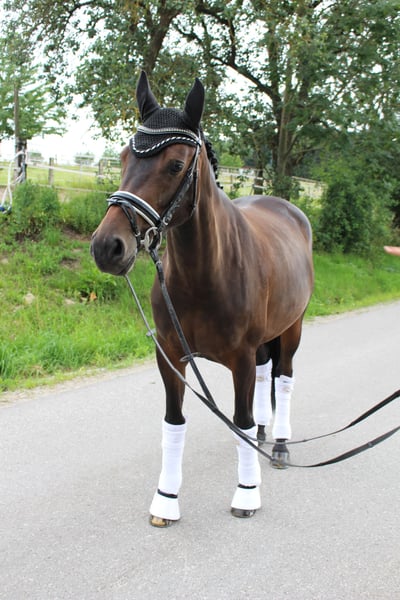 Alykessa is a very sweet and motivated young mare who loves to perform in the dressage arena. However, she also enjoys trail riding and exploring in the woods and on varied terrain. She has competed successfully up to the LM level in dressage and is always reliable at competitions away from home. Additionally, she has experience in Working Equitation, having been presented in competitions in this discipline as well. Due to lack of time, we are selling Alykessa with a heavy heart, and we wish her a wonderful new home—price is secondary! She is accustomed to various stable environments, including box stalls with turnout, open stalls, and more, and adapts very quickly. Available with full tack and accessories upon request, for an additional fee.