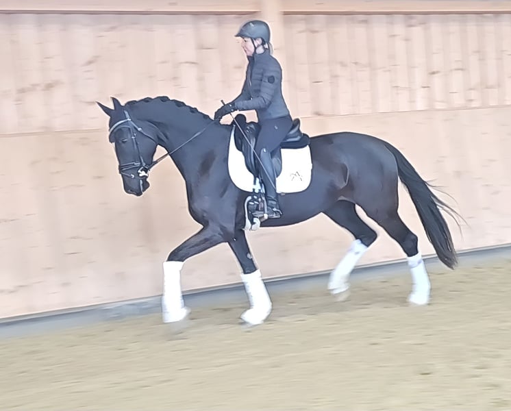 Donna Loranda ist eine qualitätsvolle Rappstute mit sehr gutem Hinterbein. Ihr Vollbruder ist aktueller Bundeschampion der 4 jährigen Reitpferde 2025. Der Stute steht in Punkto GGA und Einstellung alles offen. Lori ist sehr abgeklärt, nicht glotzig und vermittelt ein wunderbares Reitgefühl. Der Galopp ist hier ein absolutes Highlight. Die Stute ist im Herdenverband aufgewachsen und im Spätsommer 2025 von uns angeritten worden Ein sehr guter Röntgentüv von den Beinen liegt vor. Da es im Rücken einen Engstand gibt ( beeinträchtigt das Pferd 0.0) wird sie unter Wert angeboten. Klinisch o. B. Direkter Stutenstamm des Weltmeyer