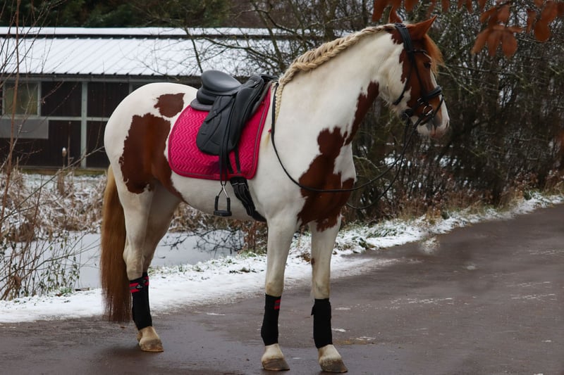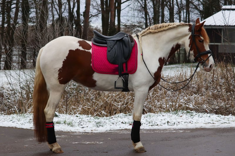 Enchanting Baroque Pinto Mare – Perfect for Leisure Riding! This charming mare, dressed in a stylish coat, impresses with her friendly temperament and her strong bond with humans. Well-trained and ridden, she consistently shows a willingness to please. She is the ideal companion for varied trail rides and relaxed leisure hours, already handling these with ease and providing a confident, secure feeling. Price will increase with further training. If you're interested or would like more information, I am happy to assist. A personal meeting is highly recommended! Videos can be provided upon request via the "Photos & Videos" tab. The mare is barefoot, has excellent hoof quality, and is accustomed to children and dogs. She is fully vaccinated and dewormed. Pre-purchase exam possible locally.