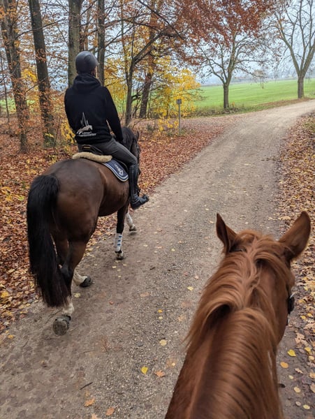 For sale is our beautiful, gentle 13-year-old mare Gladdys (Pedigree: Foundation x Delacroix Rose). Gladdys is a stunning, sensitive mare who has, among other things, become well-versed through our two young boys: she is familiar with trotting poles, balls, running children, dogs, and maintains her composure with ease and great awareness. She responds easily to rein contact, is comfortable to sit, and possesses three above-average basic gaits. Gladdys is an intelligent, attentive, and sensitive mare who is looking for an empathetic rider. She has no prior health issues, excellent hooves, clear legs, and no allergies or intolerances. She is a versatile all-rounder: - We ride her in walk, trot, and canter across terrain, on the arena, or in the riding hall. - She adapts well to unfamiliar environments and rides as calmly as at home. - She enjoys small jumps, even though she doesn’t have extensive jumping experience. - She finds pleasure in pole work, ground work, lunging, and calmness training. - Additionally, she is very well-behaved when transported alone or with a companion in the trailer, when having her hooves trimmed, or during vaccinations. Gladdys has a heart of gold. She is so reliable and cautious that our 3-year-old son can lead her alone, ride her regularly with or without a saddle, and even make his first trot attempts on her while leading. In the stable, she is a very affectionate, cuddly horse, extremely people-oriented, friendly, and enjoys spending time with “her” human. Gladdys is also a wonderful, caring mother and has given birth to five beautiful foals over the years. For the sake of completeness, it should be mentioned that Gladdys is not a “sleeping pill” and, like any horse, can lift her tail or show resistance if she doesn’t understand or doesn’t want to do something. A special mare who is very dear to us. As passionate horse breeders, we cannot keep all our horses, and therefore we are now looking for a wonderful new home for her. If you are genuinely interested, we look forward to hearing from you at 0176 22278087.