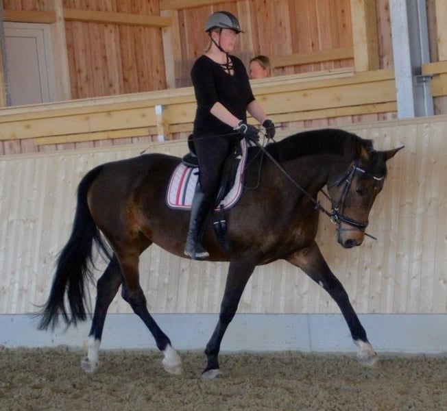 Wir geben aus Altersgründen die Pferdehaltung auf und ich werde mich von meiner bald 13jährigen Stute Taqueena trennen. Sie ist mit ihren 1,72 m Stockmaß ein sehr stattliches Pferd. Seit drei Jahren steht sie bei uns Zuhause auf dem Hof mit einem Wallach in Boxenhaltung mit täglichem Weide-/Paddockgang. Vorher war sie im Offenstall mit ca. 30 Pferden. Sie ist also beide Haltungsformen gewöhnt (fühlt sich aber vermutlich wohler, je mehr Pferde sie um sich hat). Die Vorbesitzerin hat sie als Fohlen gekauft und ausgebildet. Auf Facebook und Instagramm oder einfach mit Google sind unter Taqueena Royal noch Beiträge aus dieser Zeit zu finden. Das Bayerische Warmblut vom Zuchthof Wimmer hat eine gute Abstammung und ist kerngesund. Wir haben in den drei Jahren nie einen Tierarzt gebraucht, außer für Impfungen. Auch der Zahnarzt war im Frühjahr noch einmal zur Kontrolle da: kein Befund. Sie war schon immer Barhufer. Bei Tierarzt, Zahnarzt und Schmied ist sie brav. Taqueena ist sehr verschmust und menschenbezogen, braucht aber viel Routine und einen ruhigen und konsequenten Umgang. Sie ist lernwillig und eifrig bei der Bodenarbeit und bei der Dressur. Wir haben kleine Kinder auf ihr longiert. Zwei Anfängerinnen nehmen jede Woche Reitunterricht auf Taqueena und sind völlig vernarrt in sie. Sie ist feinrittig und in allen Gangarten sehr angenehm zu sitzen, auch ohne Sattel. Trotzdem ist sie kein richtiges Anfängerpferd, da sie ihren Reiter auch gelegentlich austestet. Ins Gelände geht sie nicht allein. Auch mit Begleitung ist sie vor allem in Siedlungen oft nervös und angespannt. Im Wald und freien Gelände ist sie eher ruhig und gut händelbar, im Straßenverkehr gab es nie Probleme. Sie braucht einen souveränen Reiter, der ihr viel Sicherheit vermittelt. Bitte nur bei ernsthaftem Interesse melden. Weitere aktuelle Videos können gerne geschickt werden. Bei ernsthaftem Interesse ist Probereiten auf dem Reitplatz möglich. Es handelt sich nicht um einen Notverkauf. Taqueena darf noch so lange bei uns bleiben, bis sich ein neuer Platz gefunden hat. Im Preis sind alle Sachen enthalten, die ich für sie habe wie Decken, Putzzeug, Pflegemittel usw. Dressursattel und Trense (wurde von der Vorbesitzerin neu für sie angeschafft und angepasst) können gegen Aufpreis erworben werden.