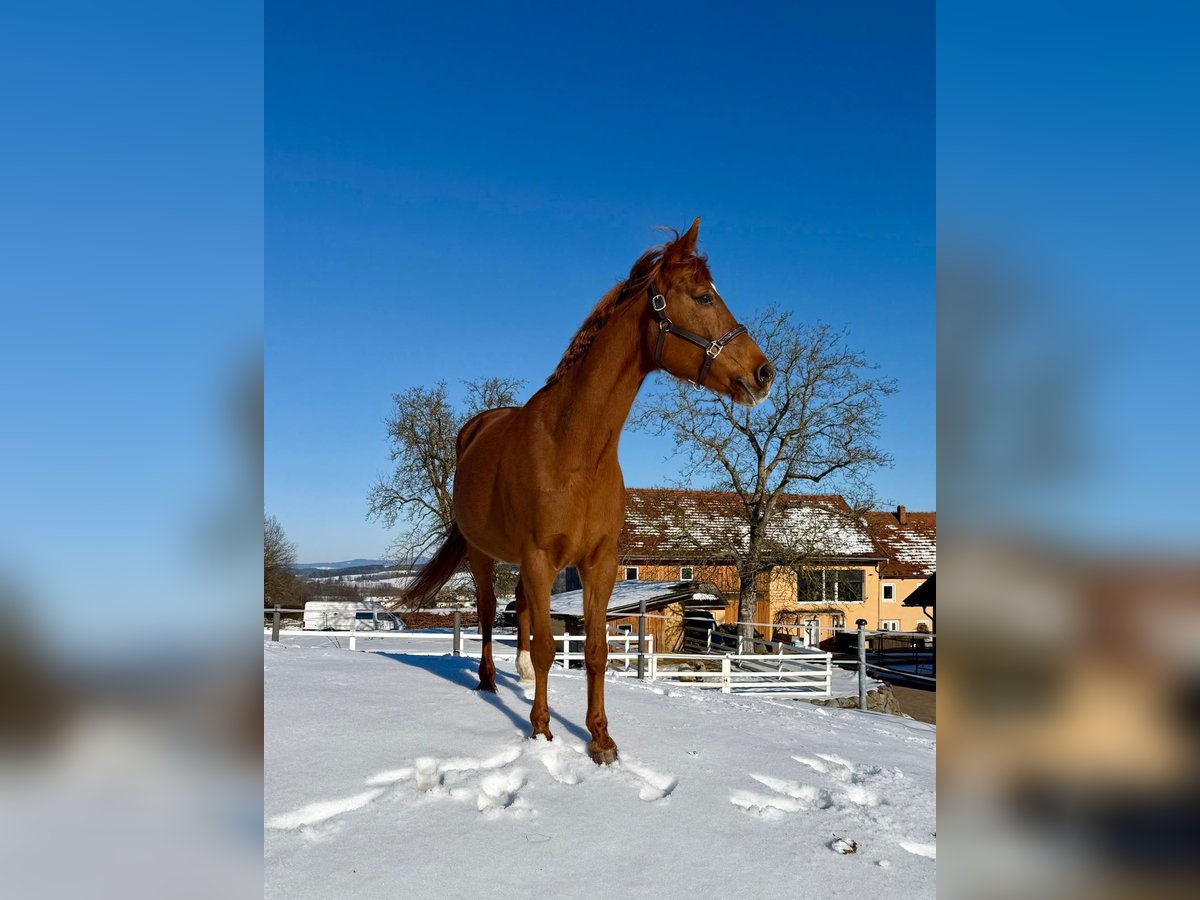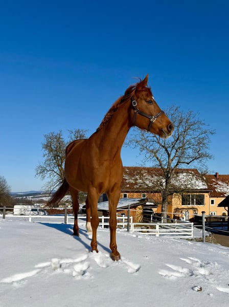 Aufgrund privater Umstände beenden wir unsere Zucht. „Puppal“, lt. Abstammungsnachweis: Panigale S, sucht ein neues, fürsorgliches Zuhause. Puppal ist eine 16-jährige Bayrische Warmblutstute nach Florestano x Pablo. Sie wurde als Prämienfohlen ausgezeichnet. Bei uns hatte sie einige Fohlen. Als Mutterstute zeichnet sie sich durch ihre unkomplizierte und fürsorgliche Art aus. Bei uns wurde sie immer im Natursprung erfolgreich belegt. Im Umgang ist sie eine geduldige und menschenbezogene Stute mit einem freundlichen, ausgeglichenen Wesen und gibt dies auch an ihre Fohlen weiter. Puppal wurde als junge Stute angeritten, jedoch bei uns nicht weiter gefördert. Deshalb wird sie als Beistell- und Zuchtstute abgegeben. Gesundheitlich sind keine Einschränkungen bekannt, somit könnte sie auch von einem erfahrenen Reiter wieder gestartet werden. Sie kennt Offenstall sowie Boxenhaltung, ist brav im Umgang, schmiede- und verladefromm und freut sich über jede liebevolle Zuwendung. Wir wünschen uns für sie ein wunderschönes Zuhause in Pferdegemeinschaft und einer Bezugsperson. Preis ist VHB.