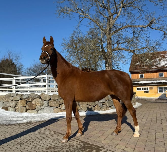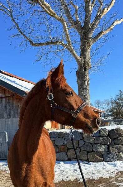 Due to personal circumstances, we are ceasing our breeding activities. "Puppal," according to her pedigree: Panigale S, is seeking a new, caring home. Puppal is a 16-year-old Bavarian Warmblood mare by Florestano out of Pablo. She was awarded premium foal status. She has had several foals with us. As a broodmare, she is known for her uncomplicated and caring nature. She has always been successfully covered naturally at our stable. In handling, she is a patient and human-oriented mare with a friendly, balanced temperament, which she also passes on to her foals. Puppal was lunged as a young mare but was not further trained with us. Therefore, she is being offered as a companion and breeding mare. No health issues are known, so she could also be restarted by an experienced rider. She is familiar with both open stable and box stall management, is well-behaved in handling, farrier- and loading-friendly, and enjoys every kind of gentle affection. We wish for her a wonderful new home within a horse community, with a caring person. Price is negotiable.