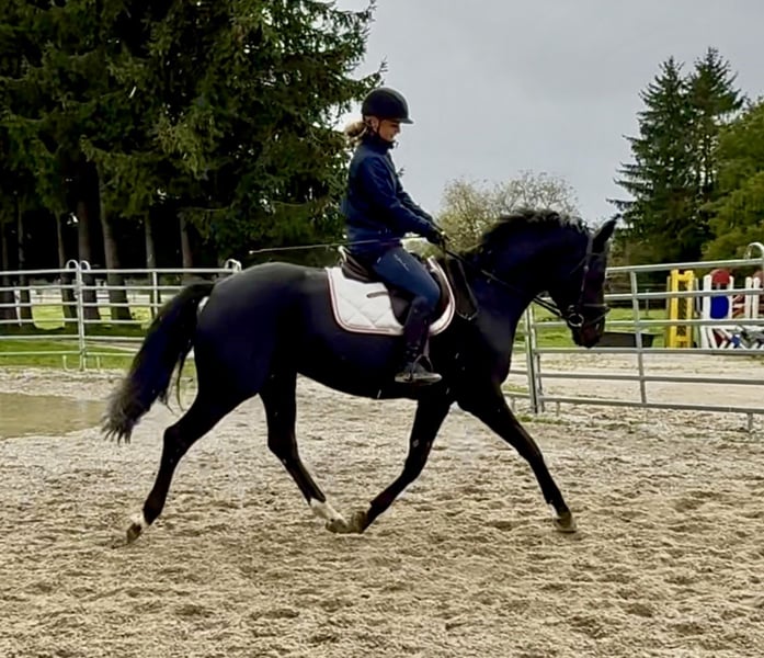 For sale is a noble black mare, born in 2017, with a height of approximately 160 cm. She impresses not only with her elegant appearance but also with her lovable character and rideability. Pedigree: Finest x Ron William – a promising dressage lineage that combines willingness to perform and exterior quality. She is always motivated, balanced, and eager to learn in both dressage and leisure riding. Due to the previous owner's lack of time, she was started late and therefore should be further challenged and developed. With her friendly nature and good cooperation, she is particularly well-suited for ambitious juniors or riders transitioning who are looking for a finely rideable horse. Whether in the riding arena or in the indoor arena – she always makes a good impression and brings joy to the riding routine. To be placed in supportive, loving hands. If you are interested or have any further questions, please feel free to contact me.
