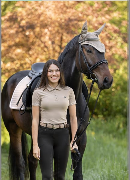 Fideroy comes from the best dressage lines: his sire Fidertanz and his dam's sire Donnerschlag speak for themselves. He has tactful, big movements that are easy to sit due to his compact body and active hindquarters. In a black-brown jacket and constructed uphill, he looks very elegant. The Kerbl company has currently used him as a model for its catalog (see photos). Fideroy is a real gentleman to handle, friendly, well-behaved and strong-nerved. He also moves calmly and courageously in the field. Fideroy has several full siblings who have won up to medium dressage level. He himself is well broken in and ready for novice level dressage horses, but has not yet been shown. We have not had any dressage-enthusiastic riders in the last 10 months. Due to the lack of competition experience and the sale of our farm for health reasons, he will be sold to a suitable rider at a reasonable price. Although he clearly belongs in dressage due to his talent, he would also be suitable for an amateur who is looking for a double-talented horse, possibly also for equitation. Florentin likes to jump and is quite capable. Good x-rays are available
