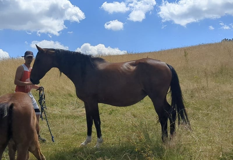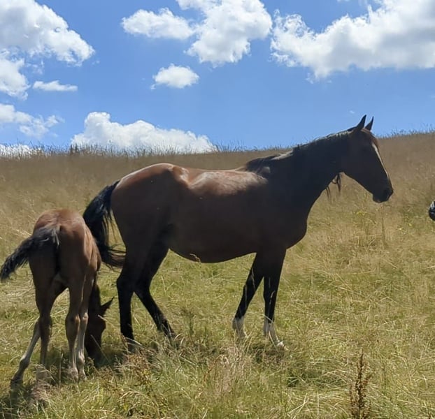 Pita has given birth to four wonderful, character-wise impeccable foals with us (some can be viewed). She conceives easily, and the pregnancy and birth have always been problem-free. As is fitting for a breeding mare, she is a great and caring mother. She is completely easy to handle. In box stalls, she tends to be a bit sassy towards passersby, but as soon as you are in the box and attend to her, she is absolutely peaceful. Pita has competed in show jumping up to 105 cm. Currently, she is not being ridden and has a foal at her side. Pita can be sold after weaning the foal. She can also be bred at the future owner's expense upon agreement. Pita is being sold due to a reduction in stock. For more details, feel free to contact via WhatsApp or phone! 015221976030