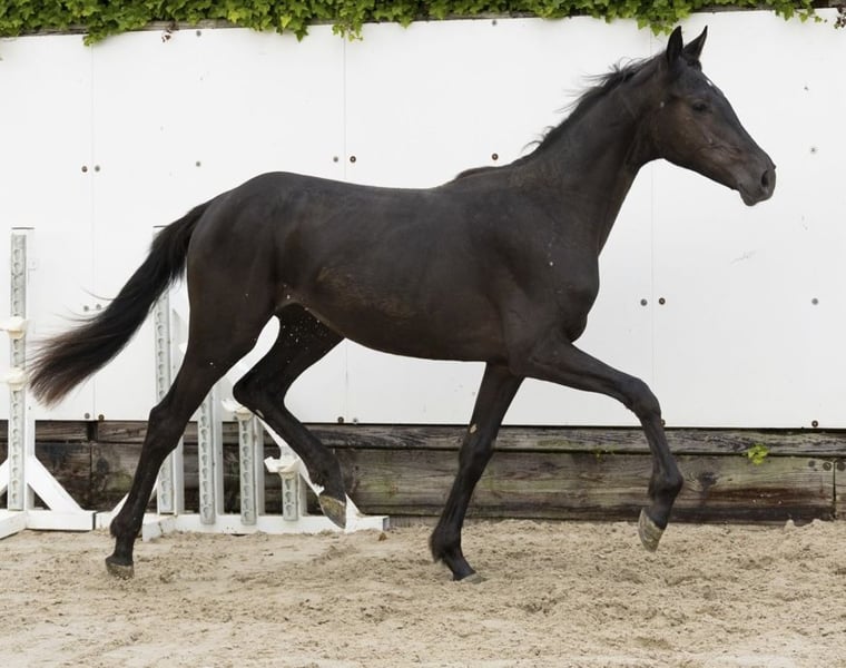 For sale is a promising 2-year-old mare with tremendous potential for show jumping. She impresses with her exceptional quality over fences, her intelligence, and her sweet, balanced temperament. This young lady is currently being raised appropriately in a herd of mares on pasture. She is halter-trained, familiar with loading and the blacksmith, and consistently displays curiosity and a willingness to learn in daily handling. Her free jumping already demonstrates considerable talent, technique, and scope – a true prospect for an ambitious rider or breeder.
