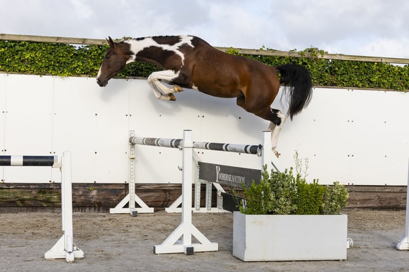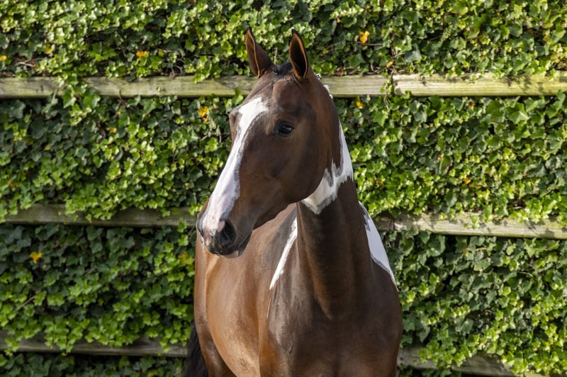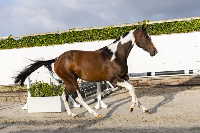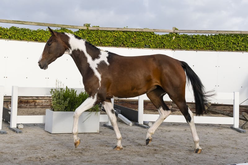 The three-year-old Winne van de Noortem is a beautifully marked pinto mare who also impresses over fences. She is very light-footed, quick off the ground and develops easy scope. Sire Fantomas de Muze is a 1.60m Grand Prix stallion out of the valuable mare Cordula de Laubry (For Pleasure). She already gave nine Grand Prix horses at 1.50m to 1.60m level, such as Global, Igor de Muze and Lord de Muze. Dam Trenitce van Loheky (Landor S) is out of the pinto international 1.40m level mare Graffitie van het Bontehof (Vene Vidi Vici van Orti), ridden by Leen Braeckmans (BEL) and later sold to Mexico. Graffitie’s dam Bonte Laura van de Dwerse Hagen also competed up to 1.40m level, her granddam Judy was a pinto as well. Bonte Laura also gave the 1.35m level horse A Kind of Magic and is granddam of AES stallion Amethist Laurentii Z (1.30m level) and the 1.35m level horses Casanova vh Bontehof Z and I Pony.
