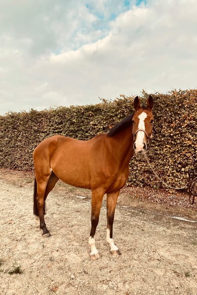 Rumba van de Goorbossen Rumba is a compact 8-year-old mare approximately 1.65 meters tall, with a strong sport pedigree. Her sire is the renowned Le Blue Diamond van 't Ruytershof, and her dam is Justine van de Goorbossen (by Casantos). This quality is clearly reflected in her appearance, movement, and posture under saddle. At the age of 4, Rumba was fully inspected and briefly backed. Due to lack of time, she was turned out to pasture again. She has been back in training for two months now and is progressing very well. She masters the basic gaits confidently and displays a lot of balance, suppleness, and willingness to work. She is very well-behaved and calm in handling, but under saddle, she can be sensitive. Therefore, she is not suitable for beginners but rather for an experienced rider with a calm and consistent approach. We are continuing her training, and she shows potential for sport. She is definitely a horse with whom you can grow together. The price depends on her current level of training. Rumba is good with the farrier and loads onto the trailer or van without any issues. For more information or videos, please feel free to send a private message.