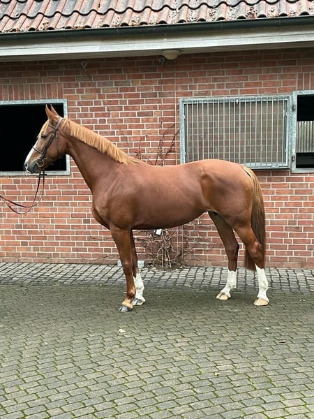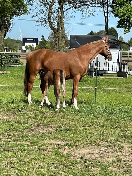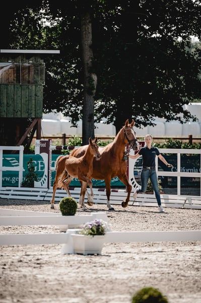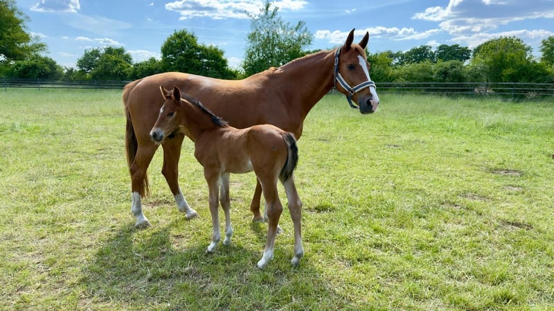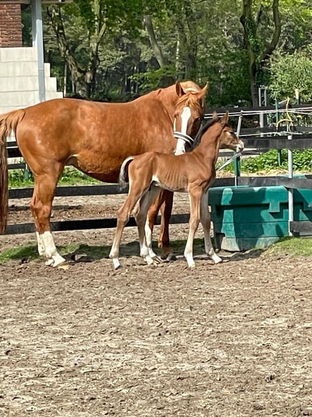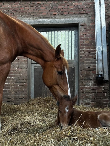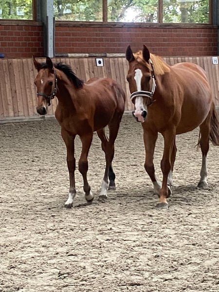 Roxanne van de Wateringhoeve, die wir nur Roxy nennen, ist eine 9-jährige belgische Zuchtstute. Sie brachte bisher 3 gesunde Fohlen und ist aktuell zum zweiten Mal tragend von Chaloubino PS OLD. Roxy stammt aus dem BWP-prestatiestam 45, einem der erfolgreichsten belgischen Stutenstämme. Über ihr Pedigree vereint sie Stempelhengste wie Chin Chin, Kashmir van Schuttershof und Darco mit Selle Francais-Blut (Lys de Darmen) und altem Hannoveranerblut (Flügel van la Roche). Der Hengst Lys de Darmen ist auch Muttervater von Quasimodo van de Molendreef (u. a. Vater von Hello Sanctos/Scott Brash) sowie außerdem Muttermuttervater von Emerald van het Ruytershof. Roxy brachte 2024 ein Prämienfohlen v. Chaloubino PS OLD (Hengstfohlen). Obwohl Roxy eher kompakt im Fundament ist, vererbt sie sich groß und langbeinig. Sie bringt ein sehr korrektes Exterieur mit großen Gelenken und sehr guten Hufen mit; ist absolut nervenstark und unkompliziert, sozialverträglich und auch mit Fohlen bei Fuß sehr unkompliziert im Handling. Aktuell steht sie tagsüber ein einer Stutenherde draußen und nachts in der Box. Ideal passen zu ihr Hengste, die eher sportlich-elegant sind; durch ihr sehr angenehmes Interieur und ihre Korrektheit gleich sie auch sehr moderne/"elektrische" Hengste gut aus. Bisher hatte sie ein Fohlen von Tangelo van de Zuuthoeve, eines von King Kashmir und das jetzige von Chaloubino PS OLD. Aktuell ist sie wieder tragend von Chaloubino PS OLD und erwartet das Fohlen im Frühling. Chaloubino (v. Chaccoon Blue - Centadel - Balou du Rouet) ist Vize-Bundeschampion, wurde 2025 in Lanaaken 2. im renommierten "Sires of the World"-Springen und ist unter Patrick Stühlmeyer international erfolgreich. Der Vollbruder von 2025 befindet sich in der Hengstaufzucht; auch er erweist sich als unkompliziert, sehr menschenbezogen und sehr korrekt. Spannend für die Zucht (weshalb Roxy auch bisher nur spielerisch angeritten, aber ansonsten ausschließlich in der Zucht eingesetzt wurde), ist diese Stute insbesondere aufgrund ihrer Mutterstute „Witske van de Wateringhoeve“. Sie brachte 5 Pferde, die mind. 1.40m erfolgreich sind, darunter mit Toulon den gekörten Carabas v / d Wateringhoeve (bis 1.60m erfolgreich) und mit Echo van het Neerenbosch den gekörten Joepie v/d Wateringhoeve (bis 1.50m erfolgreich) - dieser ist auch Vollbruder zu Roxy. Mit Capriano brachte Witske v/d Wateringhoeve Enya v/d Wateringhoeve, die wiederum Mutter von Izzy by Picobello ist (bis 1.60m erfolgreich mit Bertram Allen). Eng verwandt und aus demselben Stamm ist auch Silvester v/d Wateringhoeve, aktuell 7-jähriger Champion der belgischen Springhengste Witske v/d Wateringhoeve ist Vollschwester zu Limited Edition 3 (Zuchtname Ullrich van de Wateringhoeve), der mit Thomas Frühmann bis 1.60m erfolgreich war. Aufgrund einiger Lebensveränderungen können wir Roxy aktuell nicht mehr gerecht werden und wünschen uns für sie ein schönes neues Zuhause, in dem sie weiterhin ihrer Aufgabe als Zuchtstute nachgehen kann. Sie geht in dieser Rolle sehr auf, vererbt sich hervorragend und ist eine durch und durch angenehme Mutterstute. Selbstverständlich kann sie bei Interesse vor Ort angesehen werden. Es gilt Platz vor Preis. •