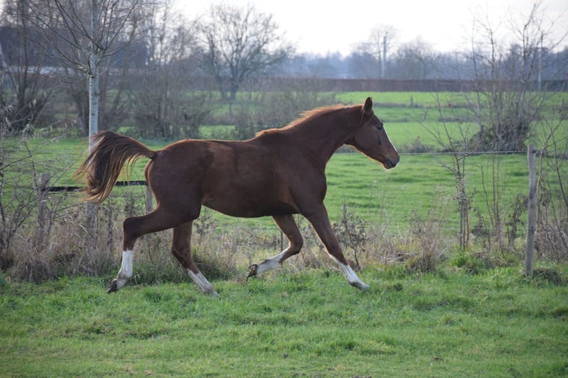 Ariletto Ballante Veelbelovende dressuurhengst – 2023 Te koop: Ariletto Ballante, een opvallende voshengst met vier witte benen, modern gebouwd en met een aansprekend model. Hij is een zoon van Rigoletto Ballante, uit een moederlijn die rechtstreeks teruggaat op de Grand Prix-hengst Painted Black. Verwachte stokmaat ca. 1m70. Ariletto is in kuddeverband opgegroeid, wat resulteert in een uitzonderlijk nuchter en sociaal karakter. Hij is mensgericht, makkelijk in de omgang en toont geen uitgesproken hengstengedrag. Hij laat zich probleemloos hanteren en leiden door verschillende personen, wat hem ook voor ambitieuze amateurs interessant maakt. In de dagelijkse praktijk is hij braaf bij dierenarts en hoefsmid, regelmatig bekapt en ontwormd. Hij is stal- en weidegewend, makkelijk uit de kudde te halen en gewend aan buitenomgeving, verkeer en verschillende geluiden. Daarnaast is hij trailergewenning en laat zich zonder problemen vervoeren. In beweging overtuigt Ariletto met zijn natuurlijke balans en souplesse. Hij beschikt over een ruime, correcte stap, een tactmatige draf met natuurlijke zelfhouding en een opwaartse, gedragen galop die gemakkelijk aan te springen is. Hij beweegt soepel door het lichaam en toont van nature een fijne manier van bewegen, zonder forceren. Ariletto Ballante is een zeer interessante jonge hengst voor wie een toekomstig dressuurpaard wil opleiden vanaf de basis: correct opgegroeid, fijn in karakter en met aantrekkelijke bloedvoering.