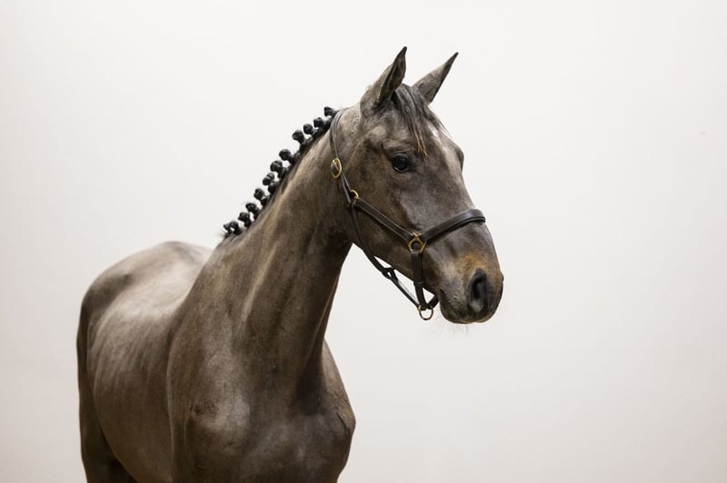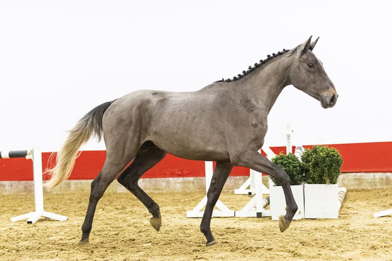 Beautiful dark grey with a modern type. He has a calm character and stays level-headed in his work. He shows a very attractive jumping style with notably strong front-end technique. Jumps well with the withers coming back and finishes the fence good. Just almost two years and already jumping full lines with ease. Shows scope naturally and plenty of commitment. Quick off the ground and consistent in his technique. A quality horse with the mindset for further development.