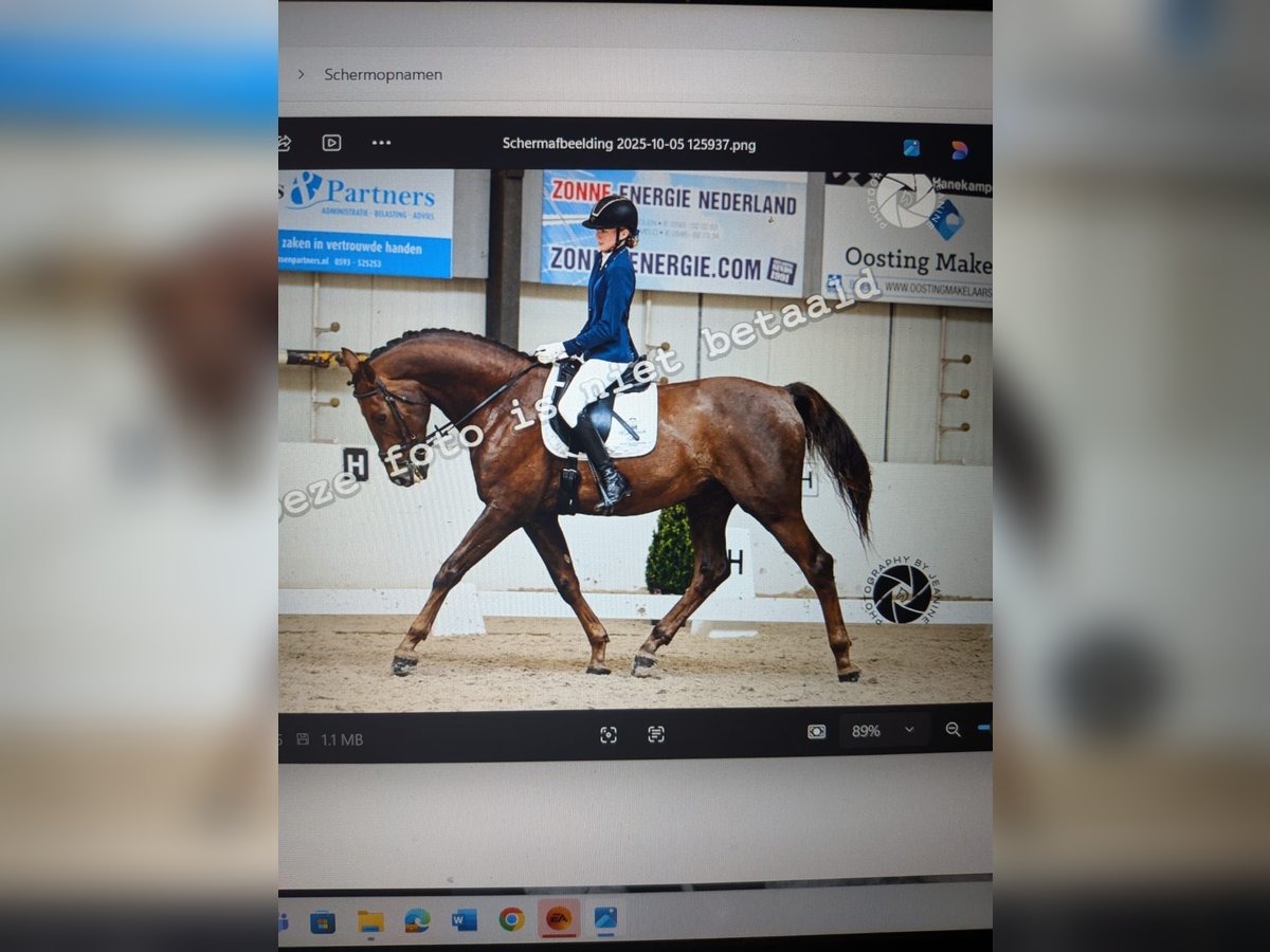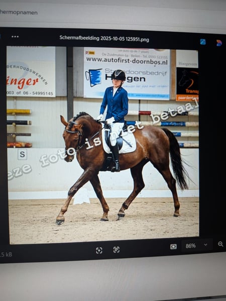 Hierbij verkoop ik na lang wikken en wegen mijn paard. Hij is 1,74 hoog maar doordat hij laat geruind is wat grover qua bouw. Hij is dressuurmatig gereden en dit jaar uitgebracht in de B klasse met 3 wp. Maar mijn hart blijft toch bij het springen liggen vandaar dus de verkoop. Qua inentingen op orde, net als de tandarts. Elk jaar komt de osteopaat maar die kan eigenlijk niks doen want krijg elk jaar te horen: Hij zit los in het vel. Om de 8 weken komt de hoefsmid. Is ontwormt. Staat op dit koment voor op ijzers maar zou ook blootsvoets kunnen. Is erg schoon in de stal, doet alles op 1 plaats. Je kan hem alleen laden, loopt zo de trailer op. Ook in donker en je kan zelfs de verlichting uitlaten. Hij kan mee op buitenrit, ook alleen. Kan dan soms wat spannend vinden maar na enige overtuiging loopt hij door. Heb met hem WE gedaan, ook dat vind hij leuk om te doen. Door zijn brede rug en rustige galop zou hij ook geschikt kunnen zijn voor voltige.