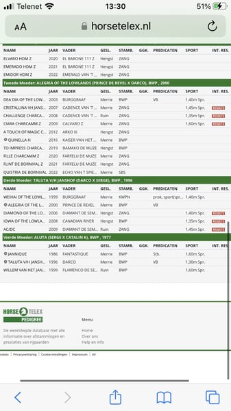 Este hijo del popular El Barone 111 Z cuenta con una excelente expresión de sangre y posee las cualidades de un verdadero caballo moderno. Combinando poder, elegancia y potencial atlético, este ejemplar destaca en muchos aspectos. Por el lado de la madre, el pedigree es igualmente impresionante, con sementales de primer nivel como Kaiser v/h Lambroeck x Prince De Revel x Darco, cada uno de los cuales ha tenido una gran influencia en la cría, produciendo numerosos caballos de deporte de alto nivel. La línea también está rica en éxitos deportivos, con actuaciones notables, como Ciara Charcamm Z, Willem v/Janshof, Trudo Jannique, que compitieron a nivel 160, demostrando la capacidad atlética y el talento transmitido a través de esta familia. Elvaro es tranquilo, para su edad y nivel es honesto y agradable de montar, también es adecuado para jinetes junior. Representa una oportunidad única para los jinetes que buscan un caballo bien criado con clase y potencial atlético. Si buscas calidad y buenas líneas de sangre y la promesa de éxito futuro, ¡aquí está tu oportunidad! más información: 0032 473 173 363